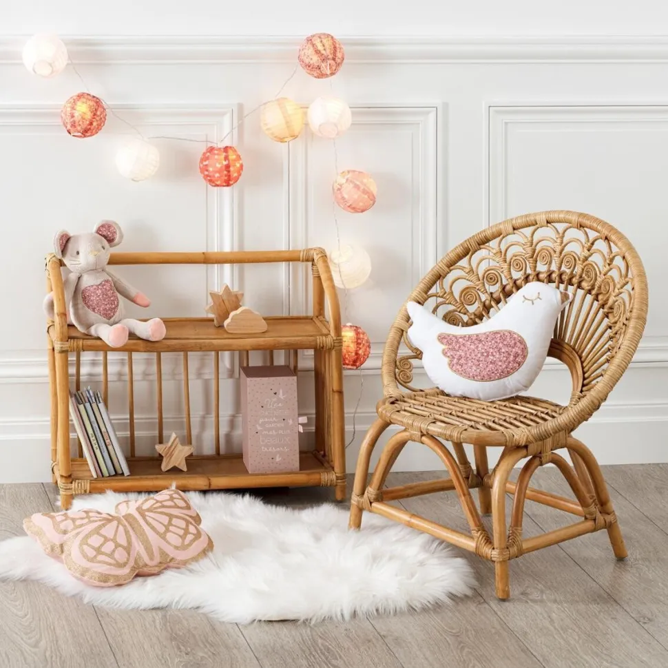 Jedną z największych zalet tego regału jest jego idealna wysokość dla dzieci. Dzięki temu, dzieci mogą bezpiecznie samodzielnie sięgnąć po ulubioną książkę, dosięgnąć do oprawy oświetleniowej lub odłożyć swoje pamiątki. To nie tylko rozwija ich samodzielność, ale także pomaga utrzymać porządek w pokoju. Biblioteczka wykonana jest z wysokiej jakości rattanu, co gwarantuje jej trwałość i solidność. Materiał ramy jest nie tylko estetyczny, ale także łatwy do utrzymania w czystości.