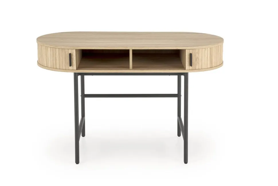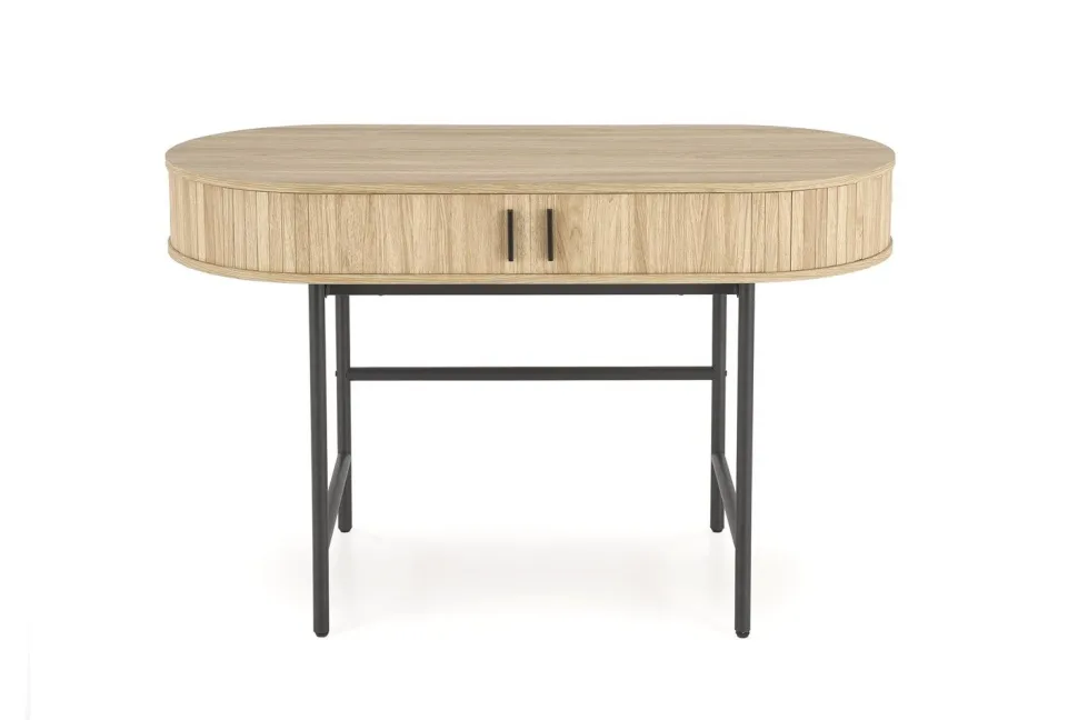 Biurko Bahli w naturalnym wykończeniu z czarnymi nogami to elegancki i funkcjonalny mebel, który doskonale wpisuje się w nowoczesne wnętrza. Charakteryzuje się solidną konstrukcją wykonaną z MDF okleinowanego, co zapewnia estetyczny wygląd oraz trwałość. Stal malowana proszkowo nadaje mu stabilność i odporność na uszkodzenia mechaniczne.