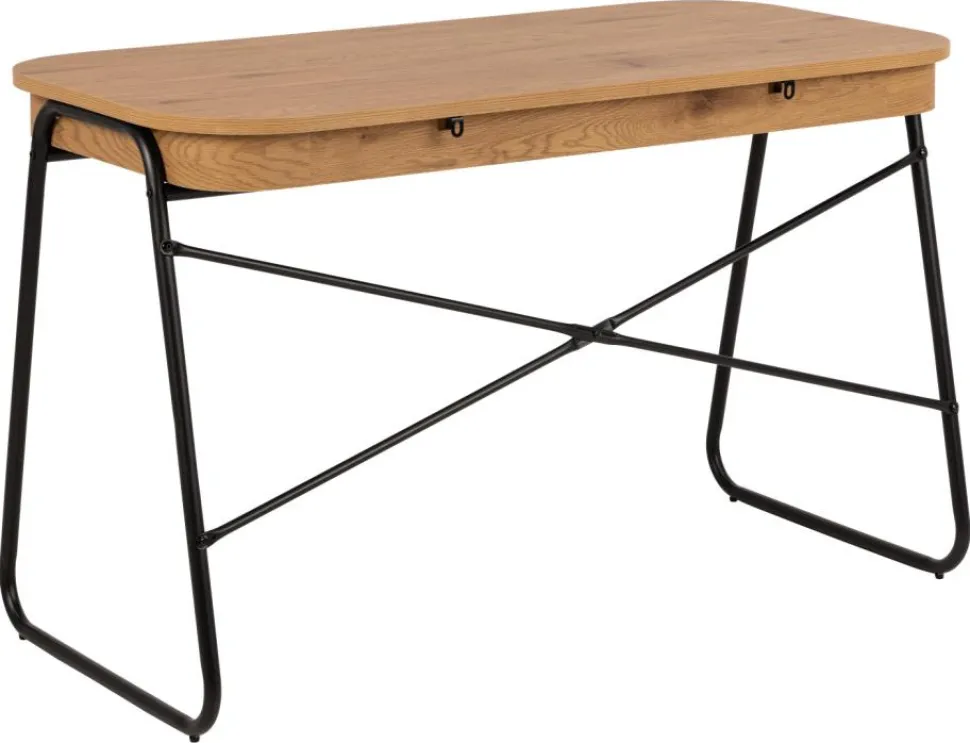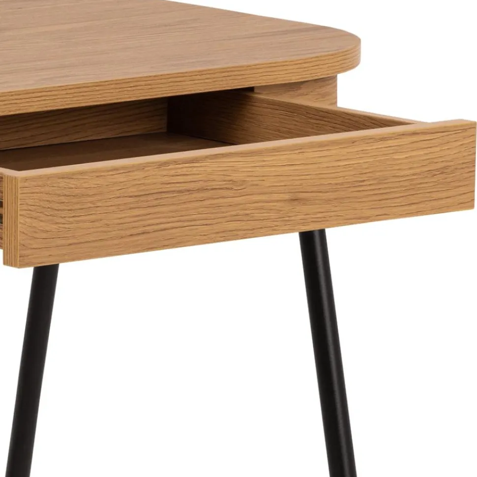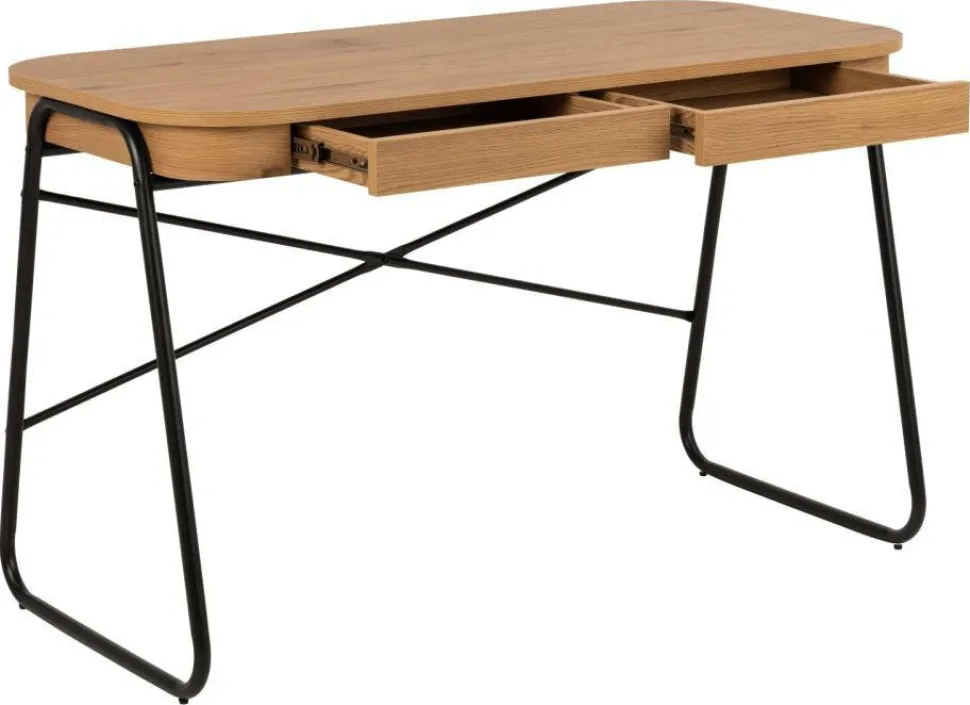 Biurko Blueton zostało zaprojektowane z myślą o praktyczności. Posiada dwie szuflady, które zapewniają bezpieczne przechowywanie zeszytów, długopisów i innych drobiazgów, co pomaga utrzymać porządek na biurku. Materiał blatu wykonany z płyty MDF z okleiną imitującą dąb zapewnia trwałość i estetykę, podczas gdy metalowa podstawa malowana proszkowo gwarantuje stabilność i solidność konstrukcji. Projekt biurka Blueton doskonale wpisuje się w różnorodne style wnętrz, w tym skandynawski, loftowy oraz nowoczesny.