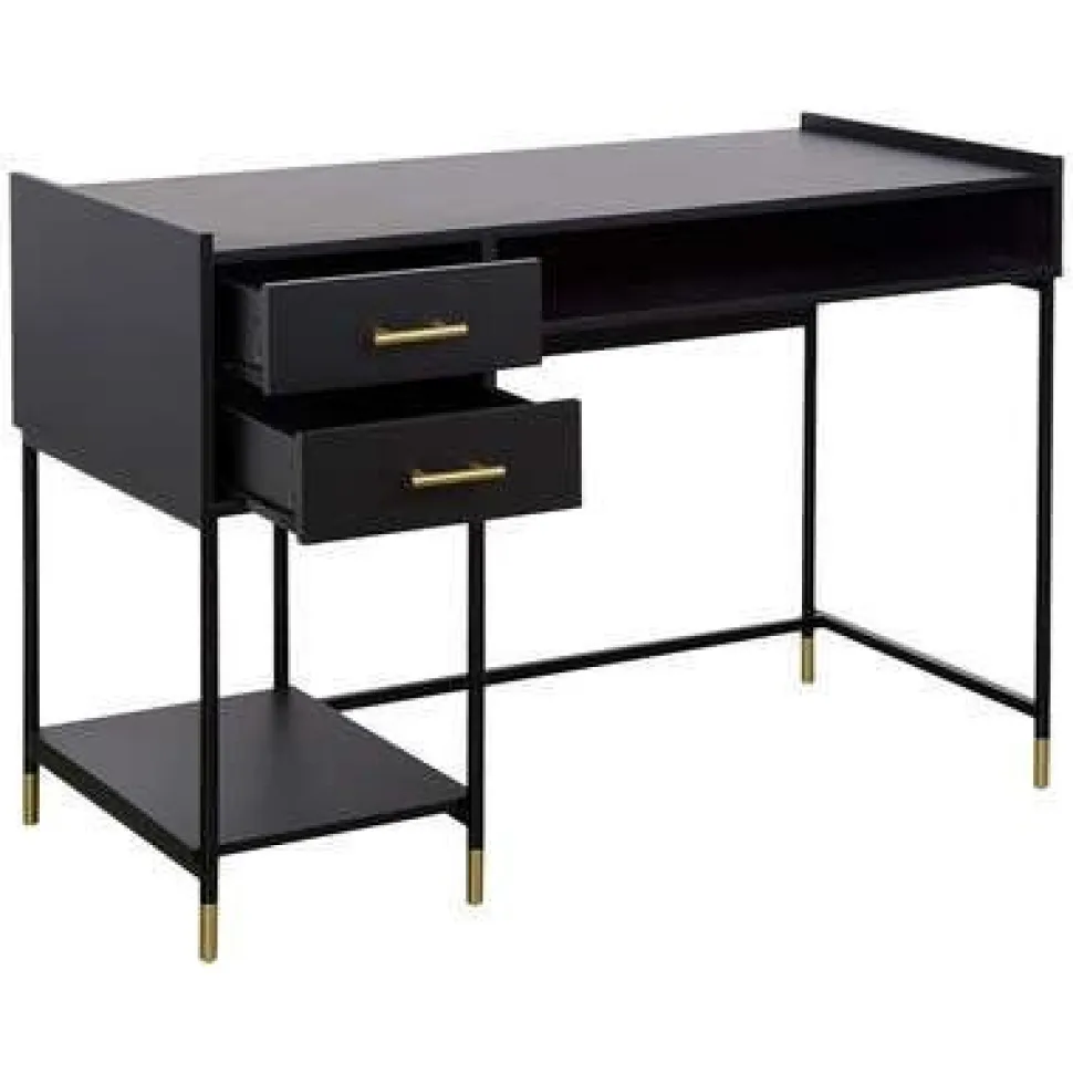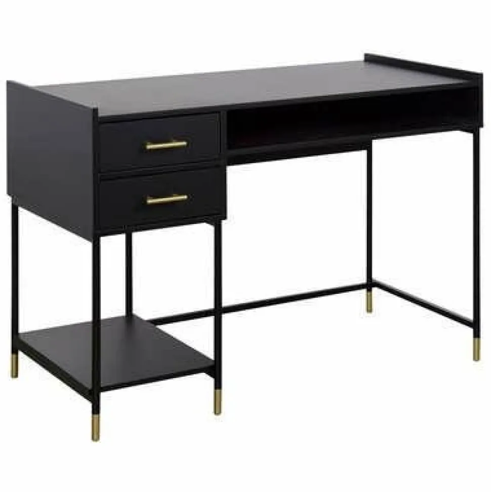 Biurko z serii mebli Tedyto kwintesencja stylu Modern glamour. Połączenie czerni z dodatkami w kolorze złotym tworzy mebel niezwykle eleganckim, obok którego nie da się przejść obojętnie. Biurko o szerokości 110 cm sprawdzi się w pomieszczeniu nawet o niewielkim metrażu. Pomoże ci przechować dokumenty, przedmioty potrzebne do pracy czy szkoły. Sprawdzi się doskonale w sypialni, pokoju nastolatka czy w biurze, a zarazem będzie niezwykłą ozdoba, która doda charakteru twojemu wnętrzu. Jest to mebel wykonany z najlepszej jakości materiałów, który posłuży ci na lata. Jeśli jesteś fanem klasycznych i eleganckich rozwiązań to trafiłeś idealnie!
