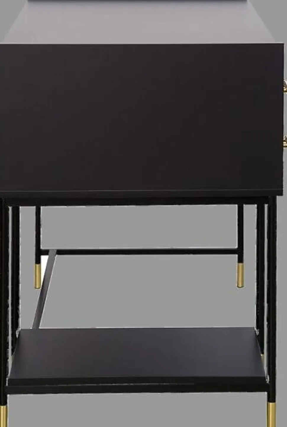 Blat i fronty biurka Tedywykonane zostały z płyty MDF, czyli bardzo wytrzymałego materiału, który odporny jest na uszkodzenia. Płyta nie chłonie tłuszczów i trudno uszkodzić ją chemicznymi preparatami. Tedy wyczyścisz bez większego problemu, wystarczy jedynie mokra ściereczka z płynem. Postawa komody wykonana została z metalu polakierowanego na kolor czarny. Natomiast elementy, które tworzą mebel wyjątkowym to uchwyty i końcówki nóg w kolorze złotym. Ten kolor idealnie kontrastuje z ciemnym kolorem mebla. Tedy wyposażona została w dwie odkryte półki oraz dwie szuflady.