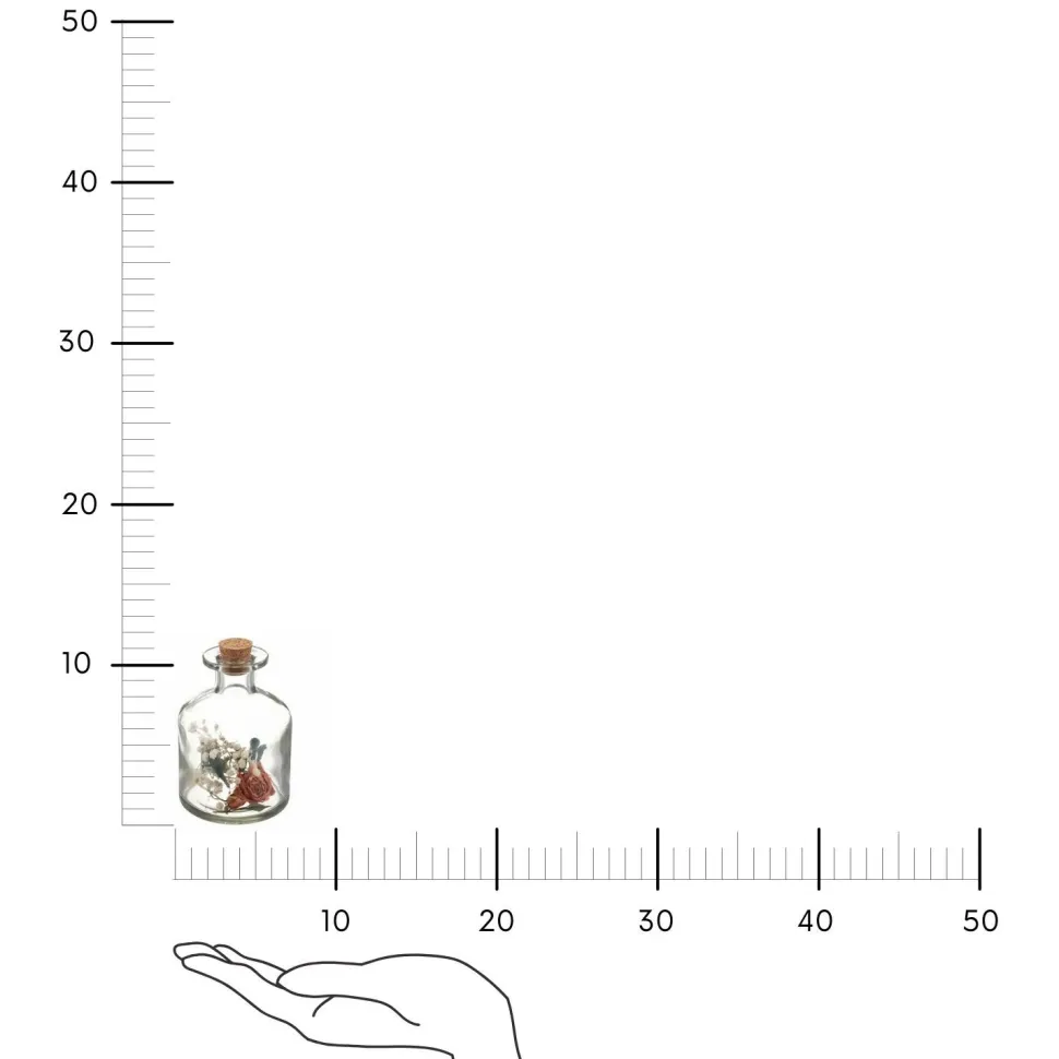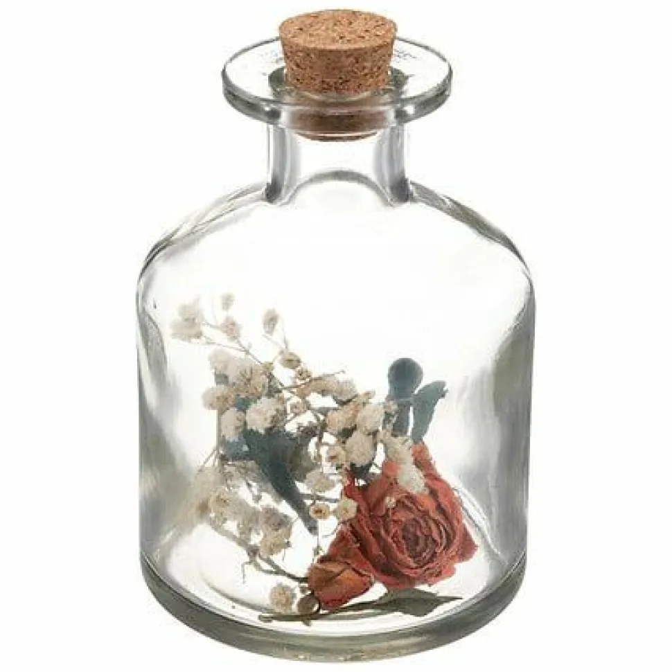 Butelka wykonana ze szkła prezentuje się niezwykle elegancko, a naturalny korek na górze dodaje jej rustykalnego charakteru. Dzięki przezroczystości szkła piękne suszone kwiaty są doskonale widoczne, tworząc zachwycającą kompozycję, która przyciąga wzrok. To dekoracyjny element, który harmonijnie wpasuje się w różnorodne style aranżacyjne, od klasycznego po nowoczesny.