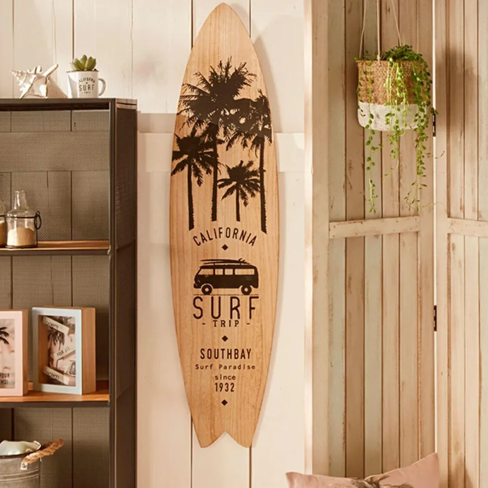 Dekoracja ścienna w kształcie deski surfingowej to absolutna perełka dla miłośników surfowania i tropikalnego klimatu. Jej wykonanie z płyty MDF w kolorze drewna dodaje wnętrzu naturalnego i przyjemnego akcentu, który od razu przenosi nas na plażę otoczoną palmami i falami.Niezwykły kształt deski surfingowej oraz czarne napisy i wzór palm nadają tej dekoracji stylowy i zrelaksowany charakter. To nie tylko zwykły element ozdobny, ale również wyrazisty wyraz naszej pasji i zamiłowania do surfowania.