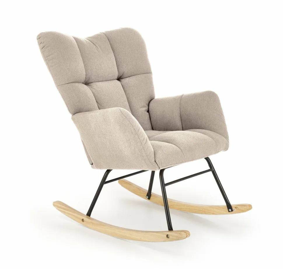 Fotel bujany Caipola w kolorze beżowym to idealne połączenie wygody i elegancji, które doskonale wpasuje się w każde wnętrze. Wykonany z wysokiej jakości tkaniny NEA, stali malowanej proszkowo oraz drewna litego, fotel oferuje zarówno wytrzymałość, jak i stylowy wygląd. Beżowa tkanina jest nie tylko estetyczna, ale także bardzo przyjemna w dotyku, zapewniając użytkownikowi maksymalny komfort. Fotel jest wyposażony w podłokietniki, które dodatkowo podnoszą wygodę użytkowania. Ozdobne pikowanie na całej powierzchni fotela dodaje mu charakteru i elegancji, czyniąc go wyjątkowym elementem każdego wnętrza. Bieguny w naturalnym kolorze drewna nadają fotelowi klasyczny wygląd, który doskonale komponuje się z różnorodnymi stylami aranżacji, w tym skandynawskim.