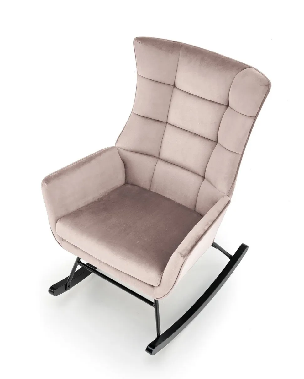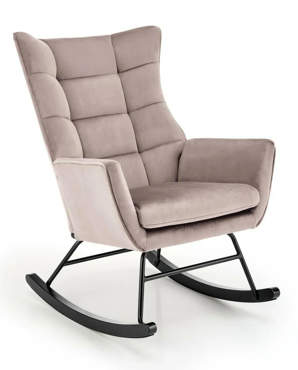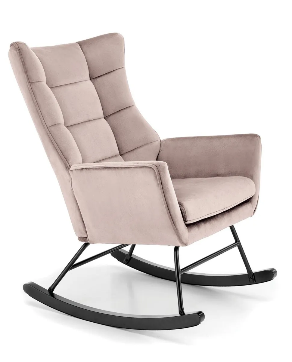 Fotel bujany Topar to idealny mebel dla tych, którzy pragną dodać swojemu wnętrzu nutę nowoczesności i skandynawskiego stylu. Tapicerowany przyjemną w dotyku tkaniną welurową, fotel oferuje wyjątkowy komfort i elegancję. Jego solidna podstawa z metalowymi biegunami zapewnia nie tylko stabilność, ale również delikatne bujanie, które sprzyja relaksowi.