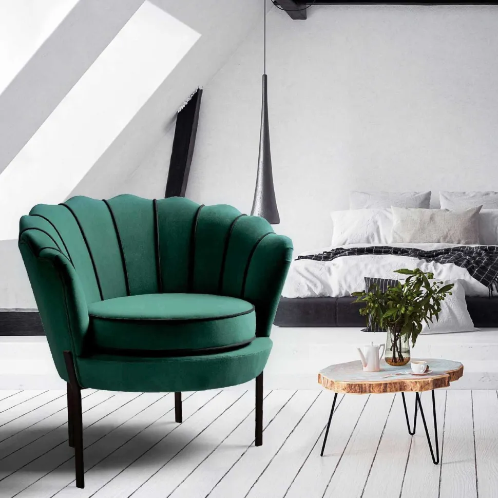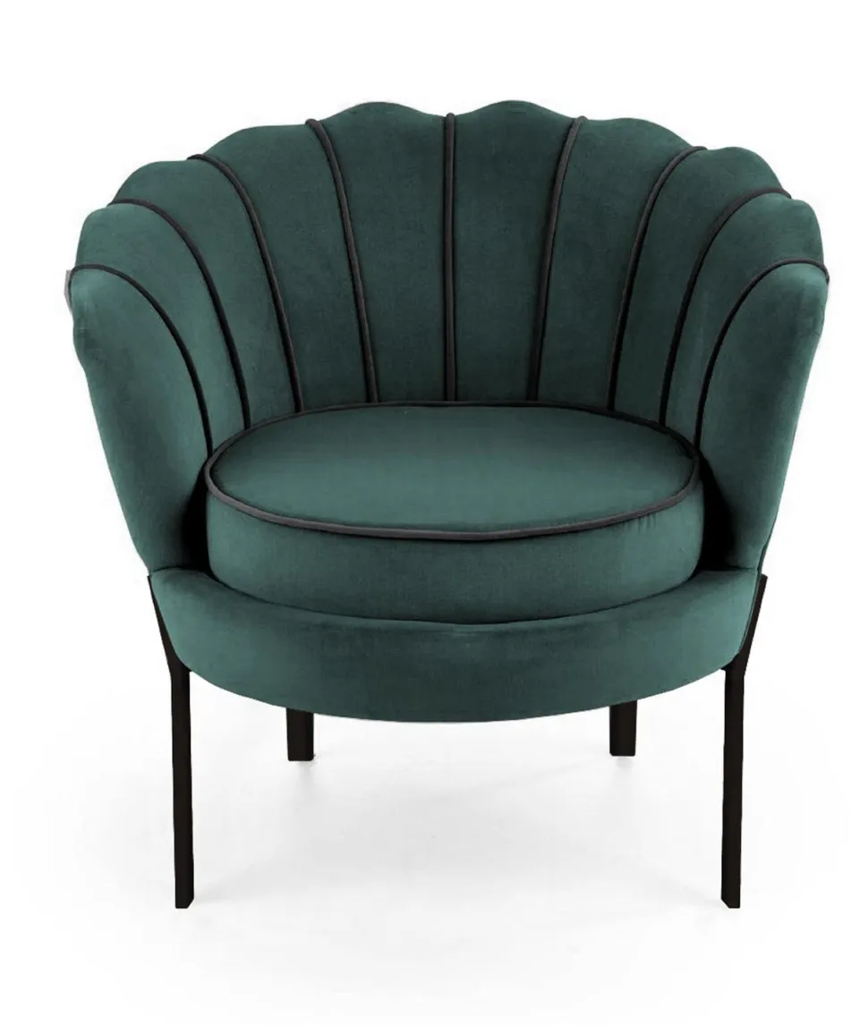 Uzyskaj idealny nowoczesny i glamour wygląd dzięki temu fotelowi muszelce od Intesi. Wyposażony w czarną metalową ramę i zieloną welwetową tapicerkę, jest idealnym krzesłem akcentującym do salonu lub sypialni.