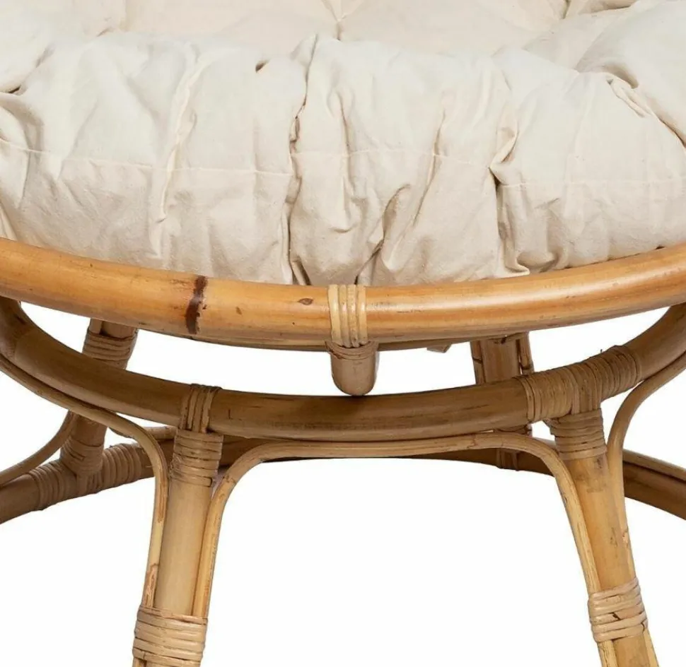 Dzięki naturalnemu kolorowi i plecionym wąskim nitkom, mebel ten wprowadzi do Twojego wnętrza egzotyczną atmosferę. Fotel jest nie tylko piękny, ale również bardzo wygodny — miękka poduszka zapewni Ci komfortowy wypoczynek. Solidna konstrukcja z pojedynczą, okrągłą nogą wykonaną z grubego rattanu zapewni stabilność i wytrzymałość. Montaż jest prosty, a poduszka wypełniona poliestrowym wkładem obita została kremową bawełnianą tkaniną.