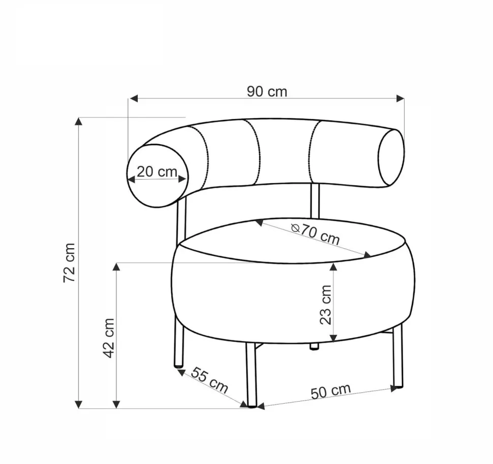 Belmira jest wyposażony w oparcie, które zapewnia dodatkowe wsparcie i komfort użytkowania. Miękkie, wygodne siedzisko ma okrągły kształt, co nadaje meblowi eleganckiego wyglądu. Smukłe, czarne nogi dodają lekkości i sprawiają, że fotel wydaje się bardziej przestronny. Fotel Belmira doskonale sprawdzi się w salonie jako element kącika wypoczynkowego, a także w sypialni przy toaletce. Jego designerska forma przyciąga wzrok i wprowadza do wnętrza odrobinę przytulności.