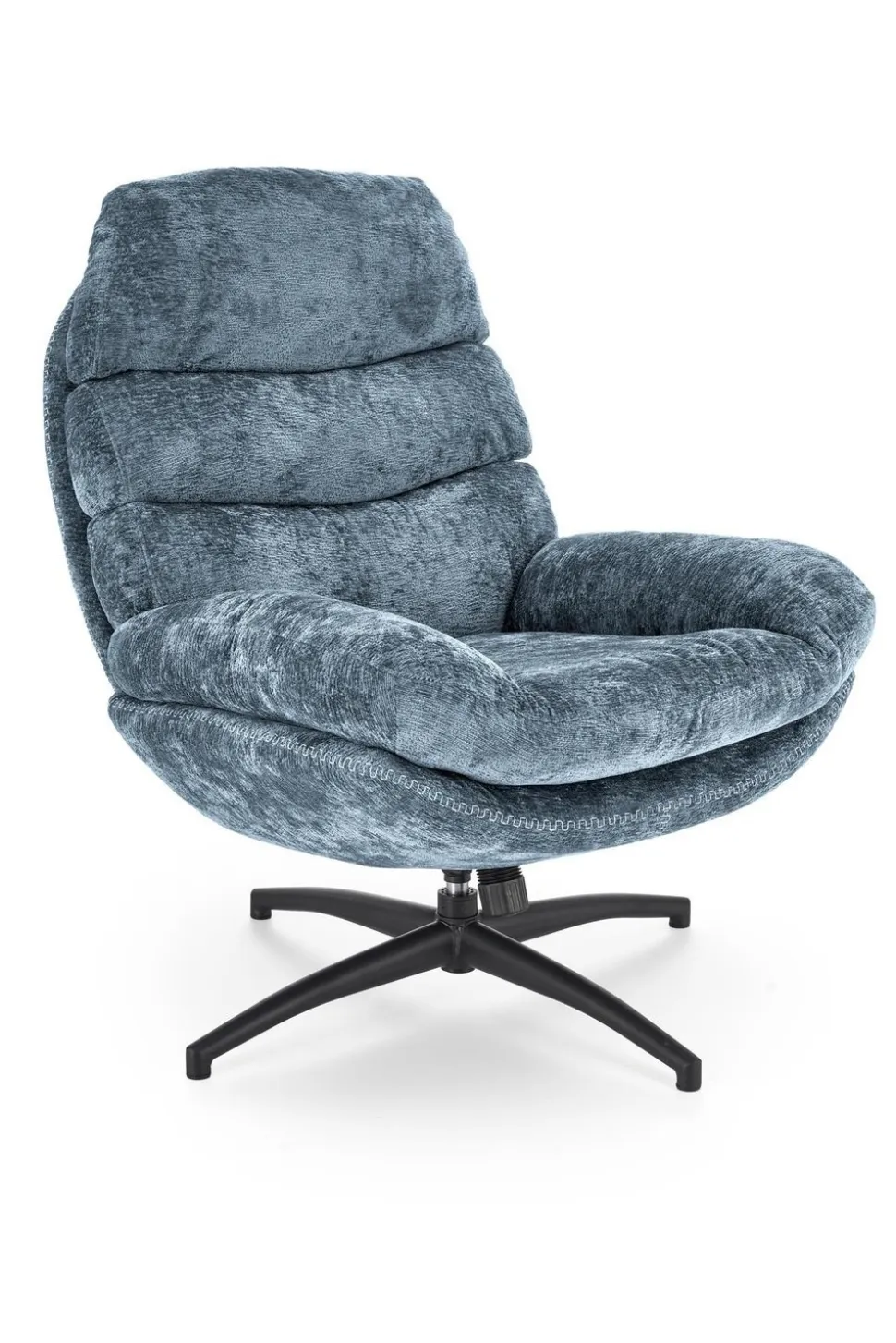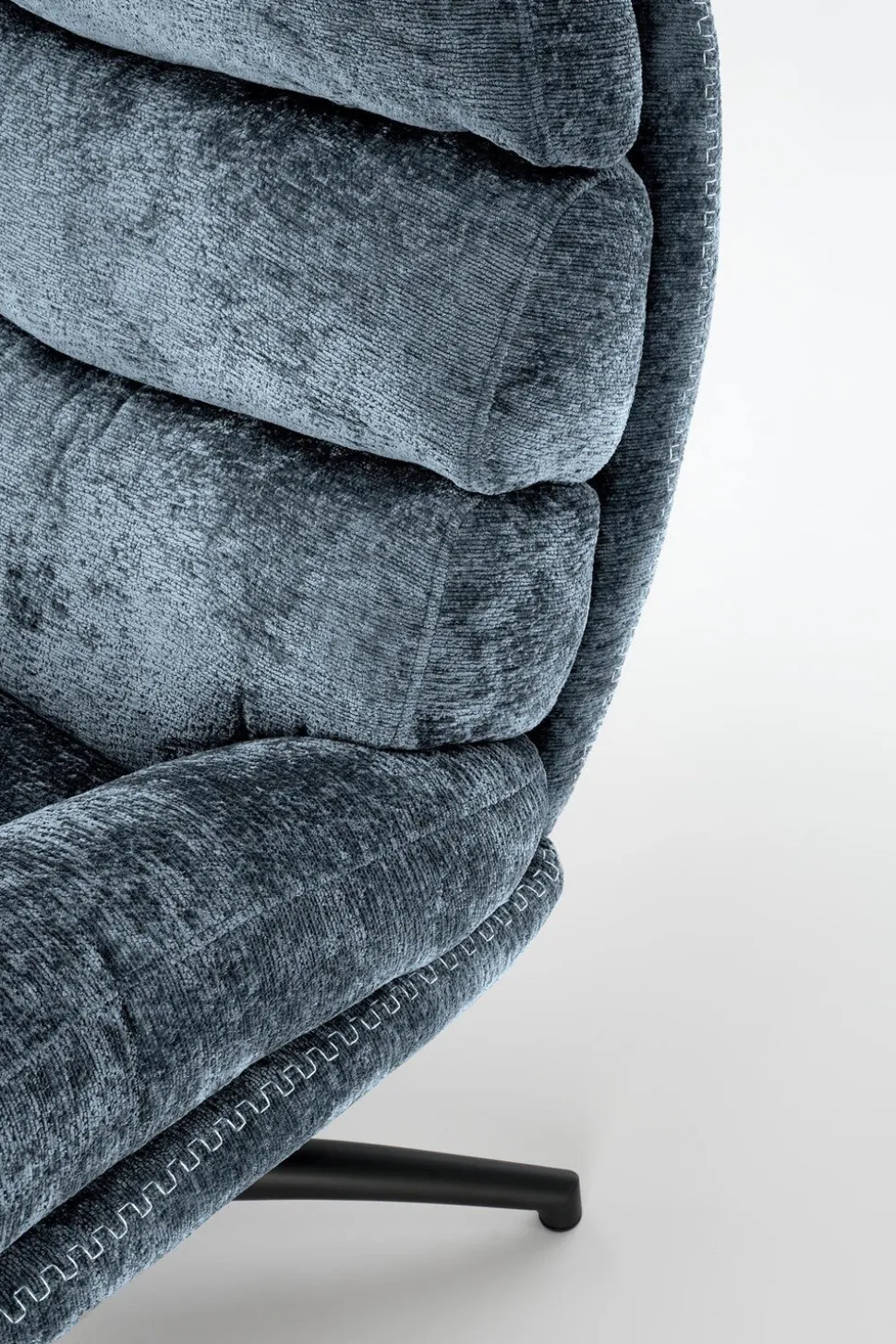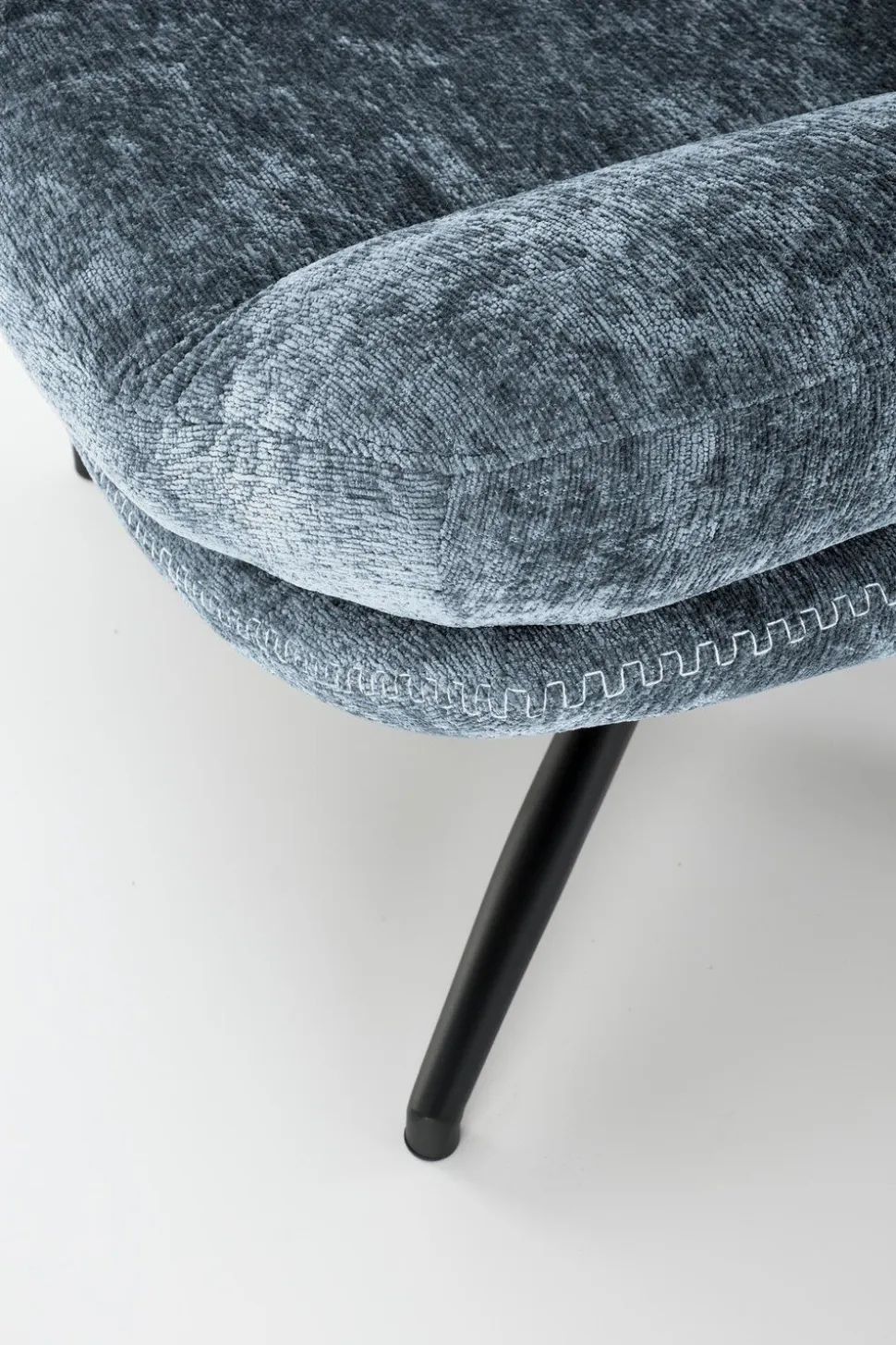 Fotel Beltine charakteryzuje się nowoczesnym i rustykalnym designem. Jego niebieska tkanina doskonale wpasuje się w każde wnętrze, nadając mu unikalnego charakteru. Czarna stalowa podstawa stanowi doskonałe uzupełnienie dla niebieskiego siedziska, tworząc spójną i estetyczną całość.