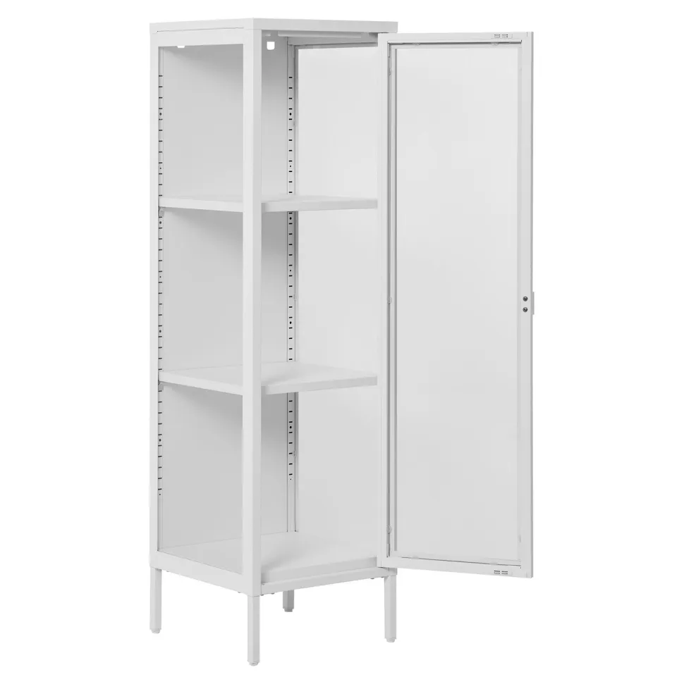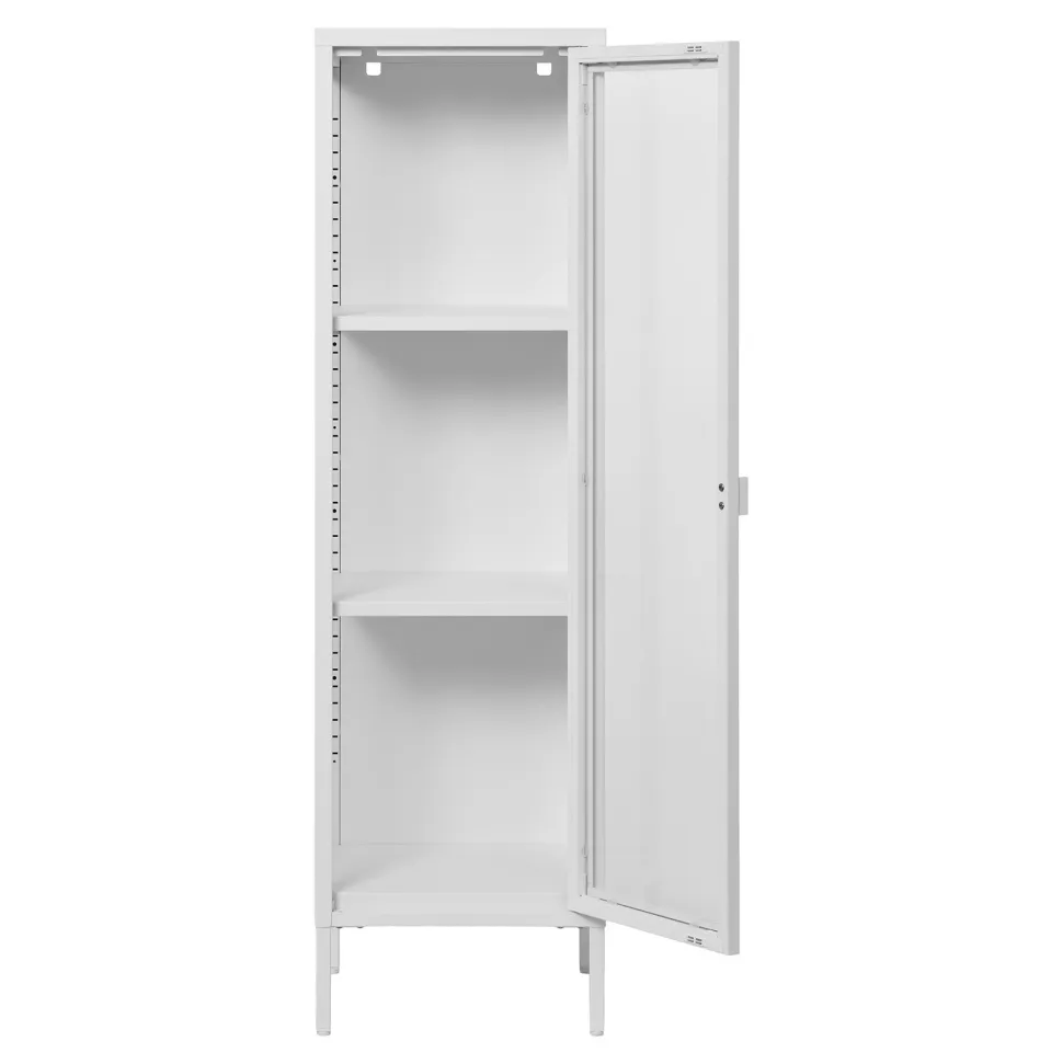 Gablota Brisbane to mebel, który wpisuje się w najnowsze trendy. Stalowa rama, białe metalowe nogi i gładki front z szkła tworzą harmonijną całość, która doskonale odnajdzie się zarówno w nowoczesnych, jak i loftowych aranżacjach. Gablota sprawdzi się w garderobie, gabinecie, pokoju młodzieżowym, przedpokoju, salonie, a nawet sypialni. Dzięki swojej uniwersalności, gablota Brisbane to mebel, który z powodzeniem znajdzie swoje miejsce w każdym domu.