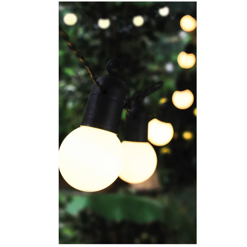 Girlanda została zaprojektowana z myślą o użytku zewnętrznym, co oznacza, że jest odporna na różne warunki atmosferyczne, w tym deszcz i wilgoć. Żarówki wykonane są z wytrzymałego plastiku, co zapewnia ich trwałość i odporność na uszkodzenia. Z napięciem żarówek wynoszącym 4,5 W oraz emitującymi 60 lumenów, girlanda zapewnia przyjemne, subtelne oświetlenie, które idealnie nadaje się do tworzenia nastrojowej atmosfery podczas wieczornych spotkań, grillowania czy relaksu na świeżym powietrzu.