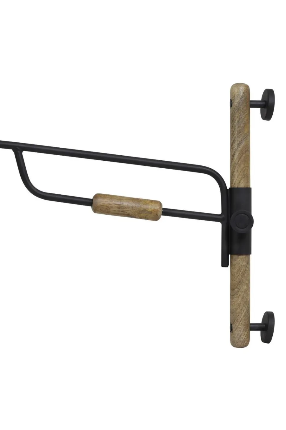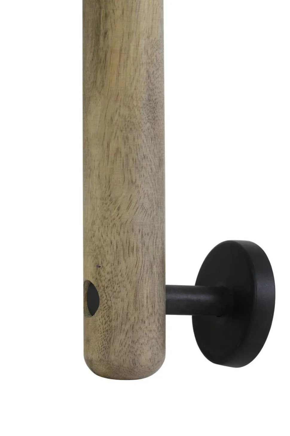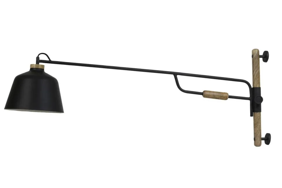 Kinkiet w stylu Loftowym to nie tylko punktowe oświetlenie, ale również instalacja, która ozdobi ścianę w sypialni lub salonie. Metalowy czarny klosz został zainstalowany na czarnej, metalowej długiej ramie. Drewniany motyw na górze klosza oraz na elemencie przylegającym do ściany nawiązuje do natury. Przewód lampy został ukryty w dolnym wsporniku lampy, dzięki czemu nie będzie widoczny podczas zamontowania kinkietu.