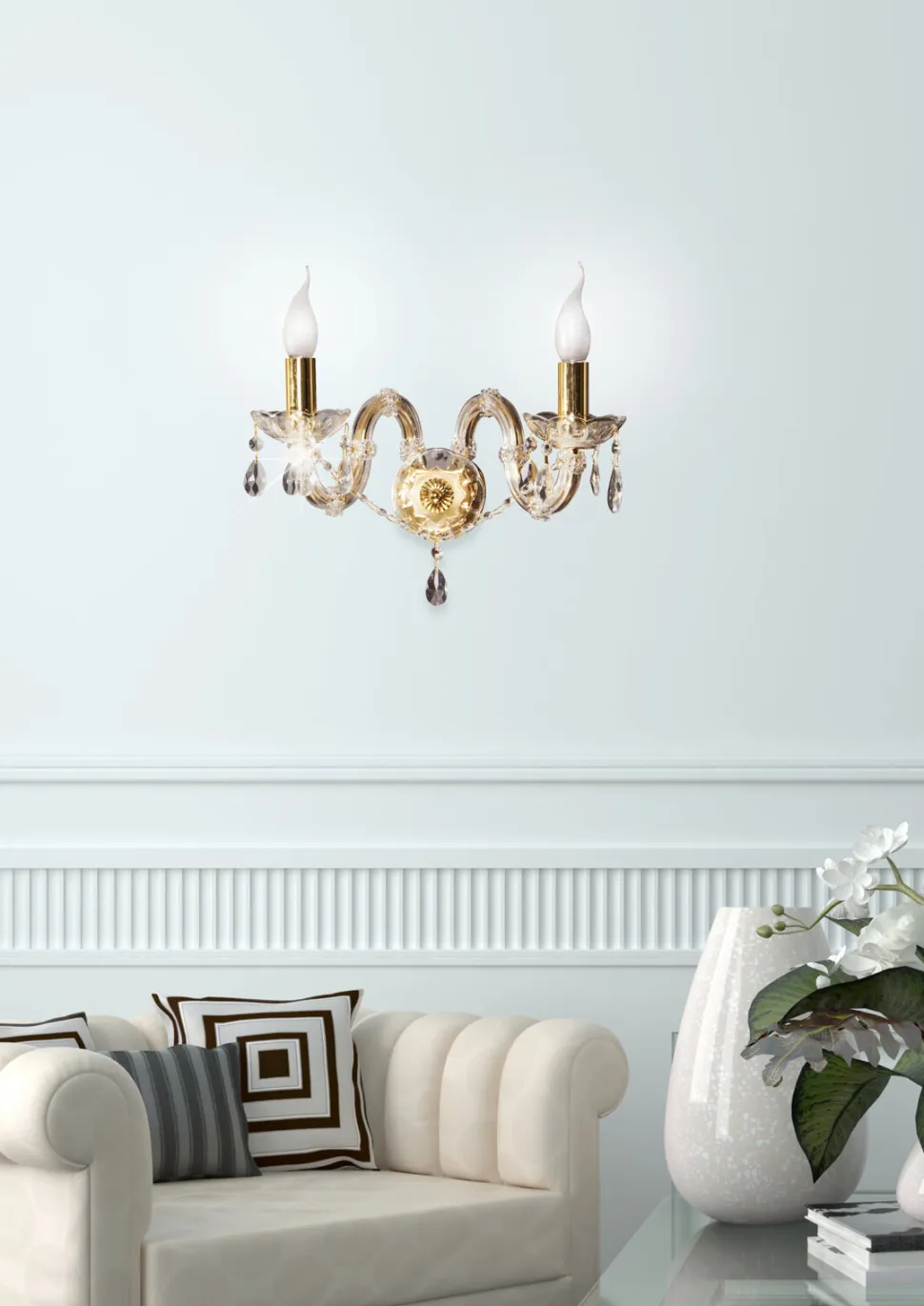 Kinkiet Maria Teresa 2x40W E14 złoty, to produkt, który dzięki swojemu wyjątkowemu designowi i zastosowaniu najwyższej jakości materiałów, z pewnością stanie się główną atrakcją każdego pomieszczenia. Złote wykończenie dodaje mu elegancji, a bogate zdobienia kryształowe wprowadzają do wnętrza odrobinę blasku i luksusu. To doskonały wybór dla osób ceniących klasyczne rozwiązania z nutą glamour.