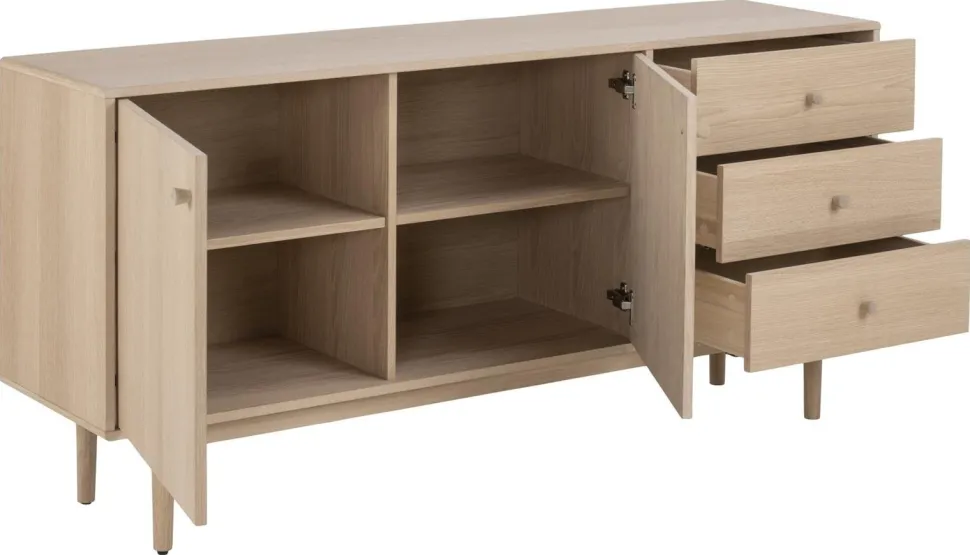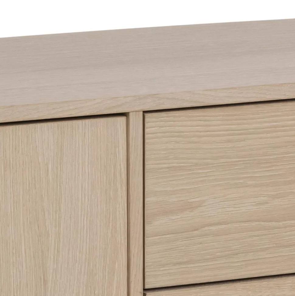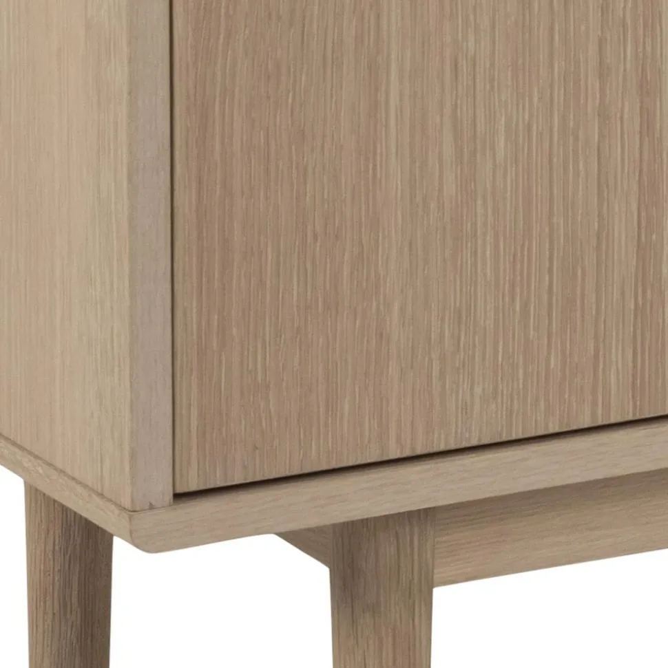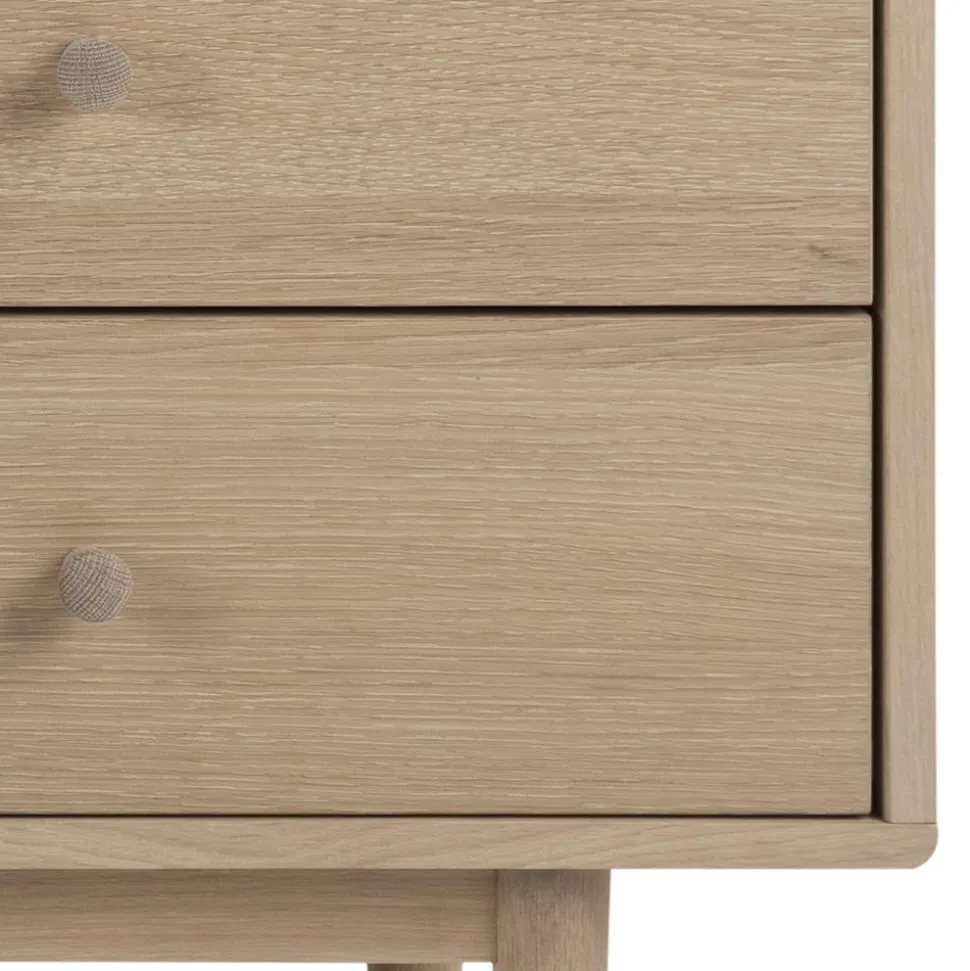 Komoda została wykonana przy użyciu płyty wiórowej i wykończona bielonym fornirem z drewna dębowego. Fornir został zabezpieczony olejem, dlatego drewno zachowało swój naturalny kolor i strukturę. Nogi komody to z kolei lite drewno dębu, które również zostało poddane olejowaniu.