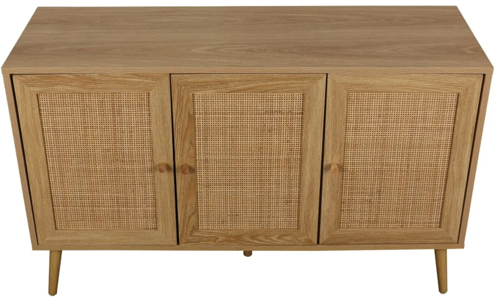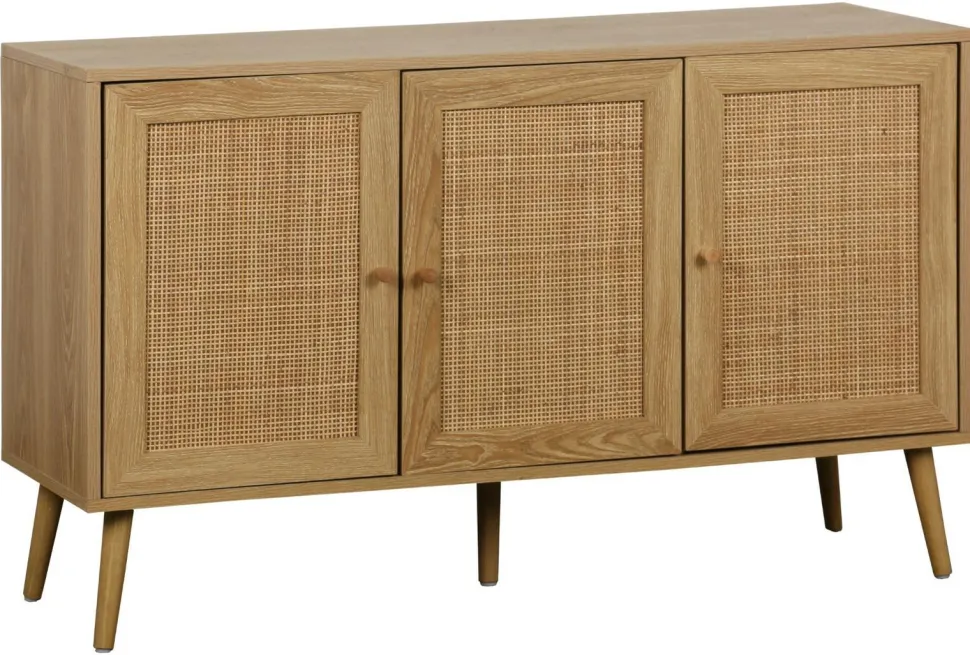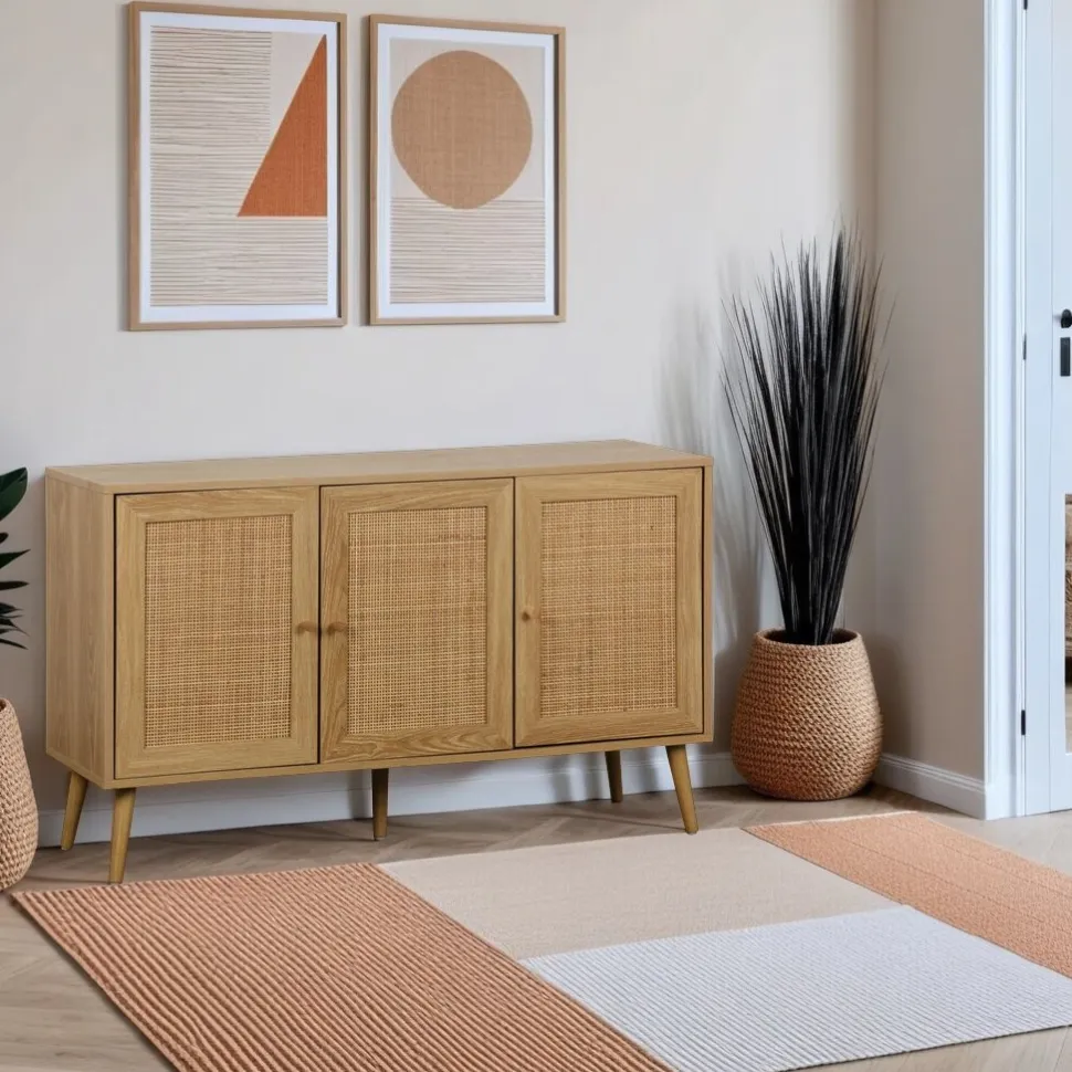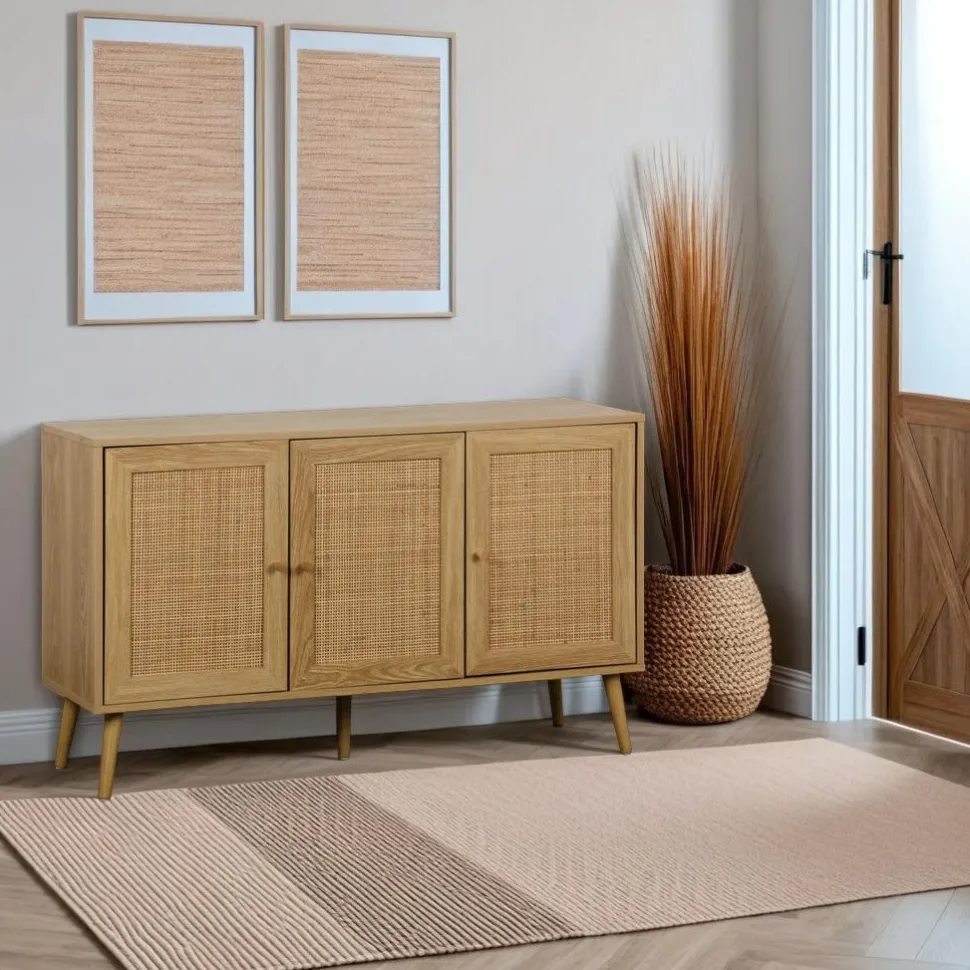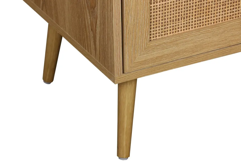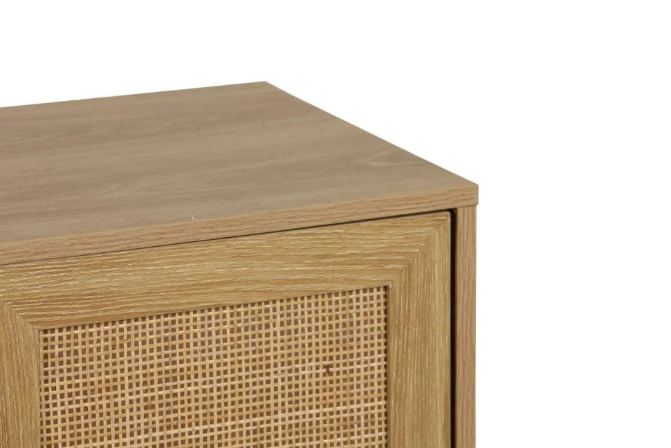 Jasny, ciepły odcień drewna sprawia, że komoda Ballo doskonale komponuje się z beżowymi i neutralnymi wnętrzami. Jej estetyka wprowadza do przestrzeni przytulność oraz lekkość, tworząc harmonijną atmosferę. Dodatkowo, rattanowe dekoracje frontów nadają meblowi oryginalności i podkreślają jego boho charakter.