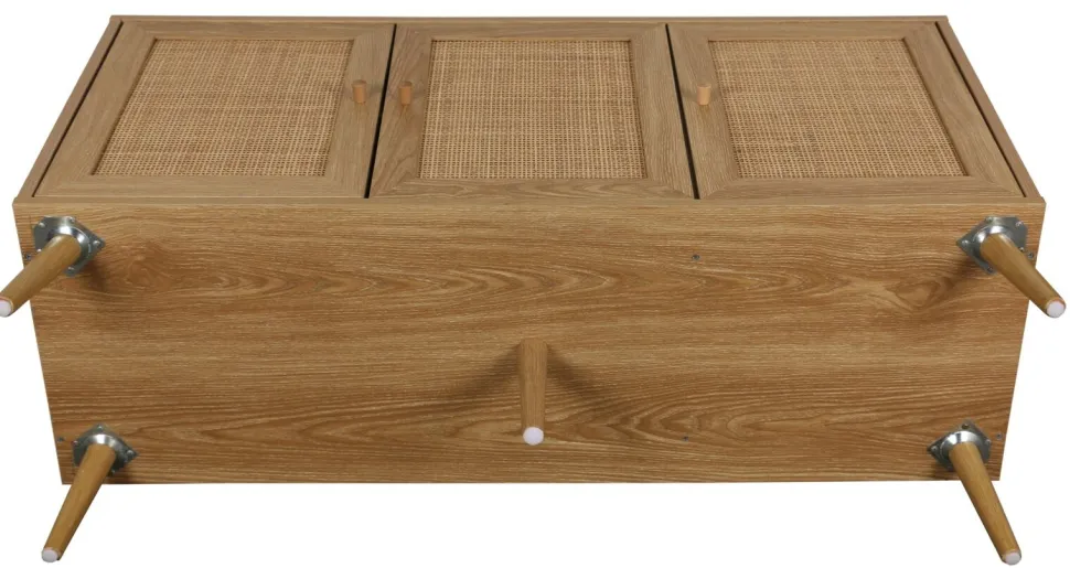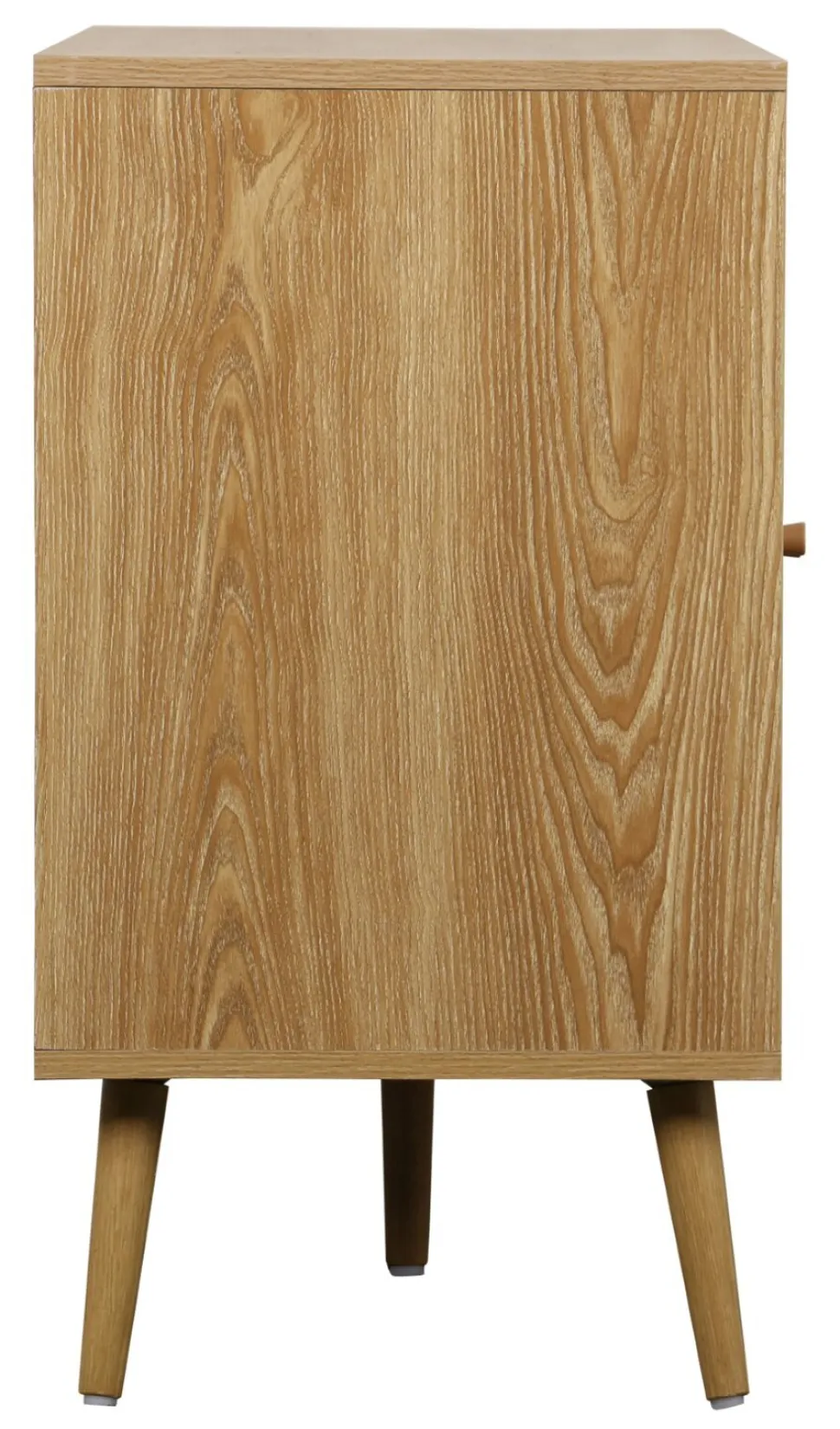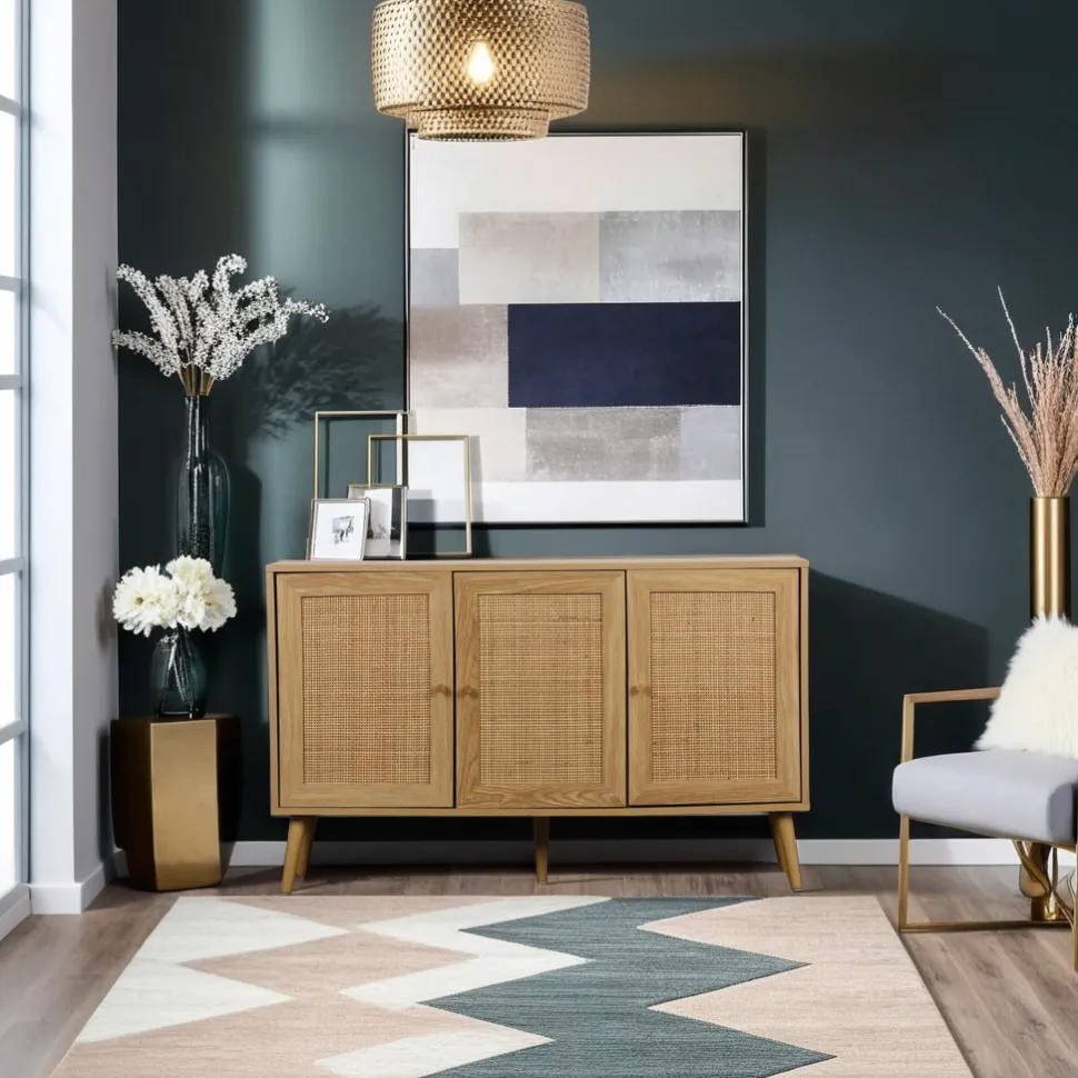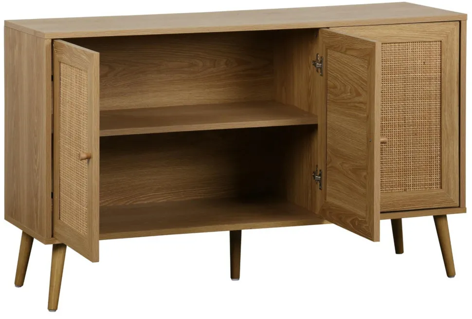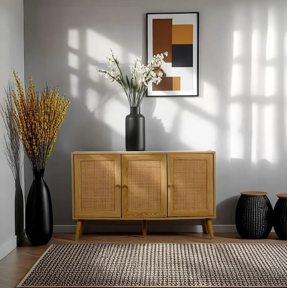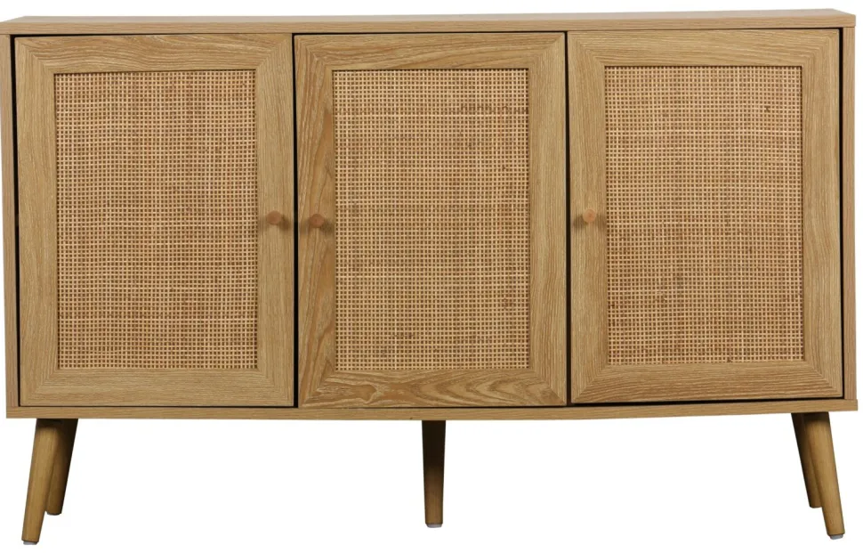 Jasny, ciepły odcień drewna sprawia, że komoda Ballo doskonale komponuje się z beżowymi i neutralnymi wnętrzami. Jej estetyka wprowadza do przestrzeni przytulność oraz lekkość, tworząc harmonijną atmosferę. Dodatkowo, rattanowe dekoracje frontów nadają meblowi oryginalności i podkreślają jego boho charakter.