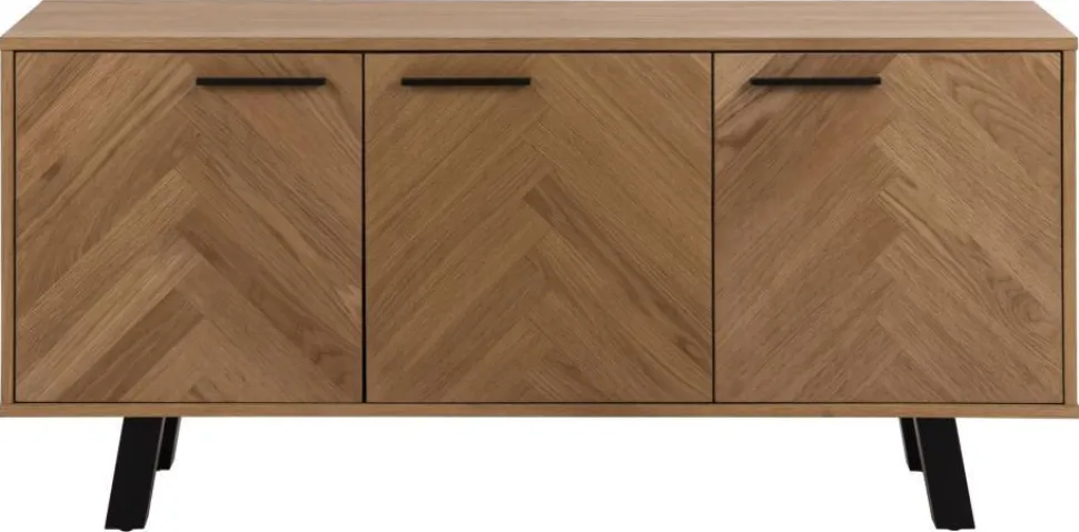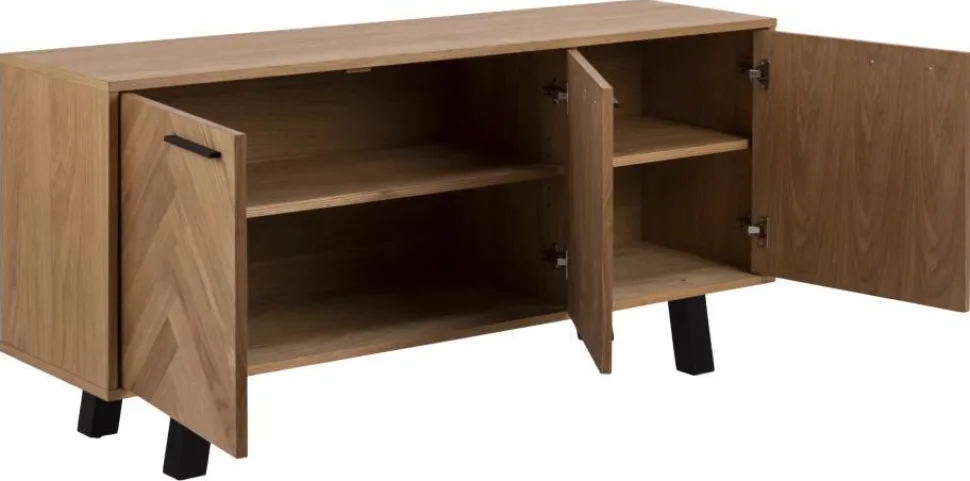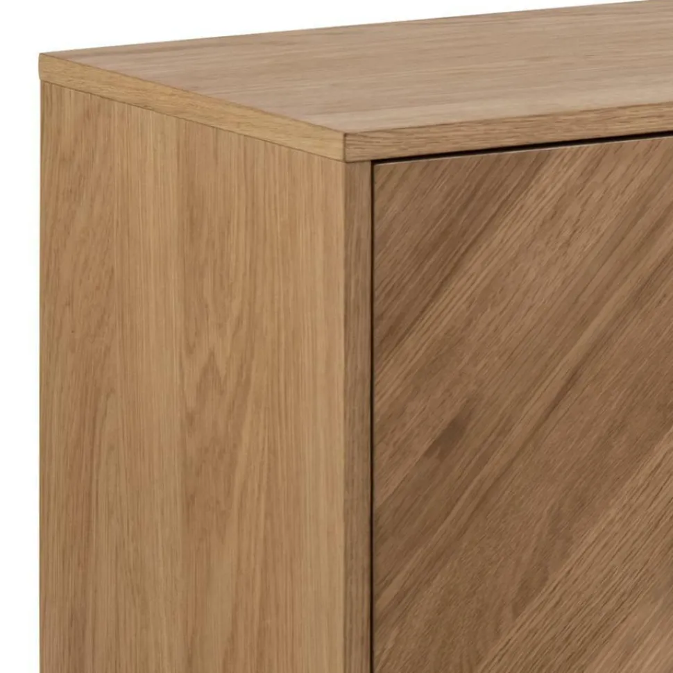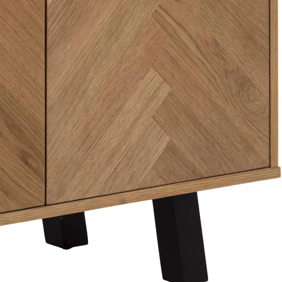 Komoda Brighton to piękne, doceniane na całym świecie skandynawskie wzornictwo. Mebel został wykonany metalu i płyty meblowej, dzięki czemu jego ogólny charakter sprawia, że prezentuje się niezwykle lekko i efektownie. Olejowane fronty komody z płyty meblowej pokryte zostały paskami z forniru dębowego ułożonymi w modny wzór jodełki. Taki szczegół z pewnością przyciągnie uwagę nawet najbardziej wymagających. Korpus komody to również płyta meblowa pokryta fornirem dębowym o nienagannej strukturze i gładkim wykończeniu. Podstawą komody są cztery lekko pochylone nogi wykonane z metalu pomalowanego na czarno. Metalowe uchwyty ułatwiają otwarcie szafek. Komoda posiada dwie szafki, które skrywają pojemne półki.