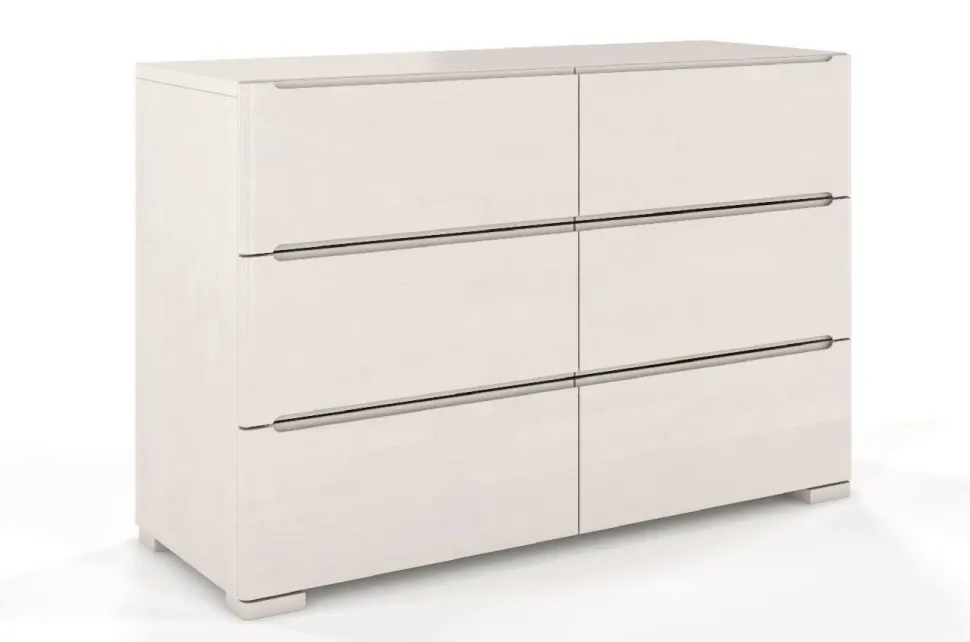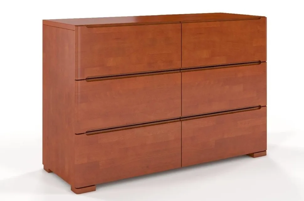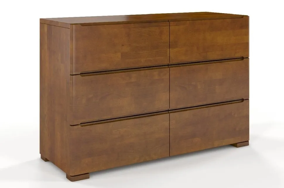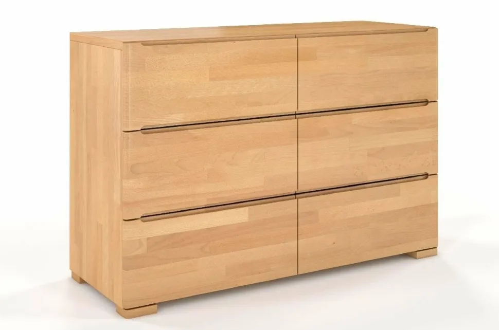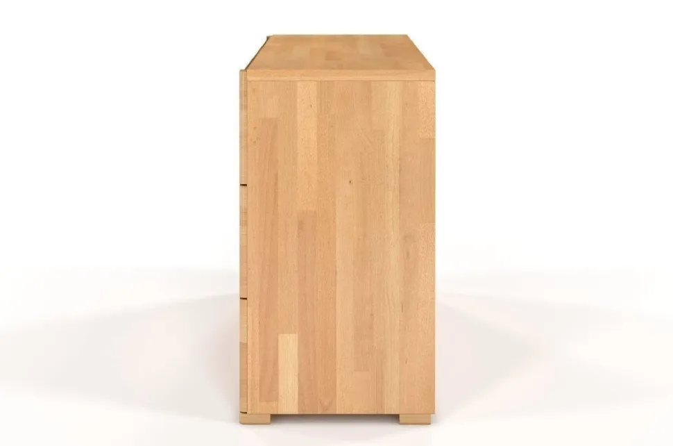 Komoda SPARTA wspiera się na subtelnych, ale niezwykle mocnych nogach, które dbają o jej stabilność. Narożniki nóg i boczne krawędzie komody zostały zaokrąglone, dodając opływowego kształtu i lekkości, jednocześnie podnosząc bezpieczeństwo mebla. Aby pogodzić wizualną skromność modelu i użytkową potrzebę wygody, uchwyty to frezowane wycięcia w krawędziach szuflad.Materiał: lite drewno bukoweWykończenie drewna: bejca + ekologiczny lakier wodnyDno szuflady: płyta HDF (standardowa płyta wykorzystywana do wykonywania dna szuflad w meblach)Prowadnice w szufladach: z systemem cichego domyku i hamulcem – szuflada zwalnia podczas zamykania, domykając się cichoUchwyty w szufladach: brak; wycięcia w krawędziach szufladŁączenie elementów mebla: śruby; metalowe okucia