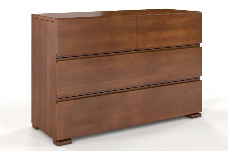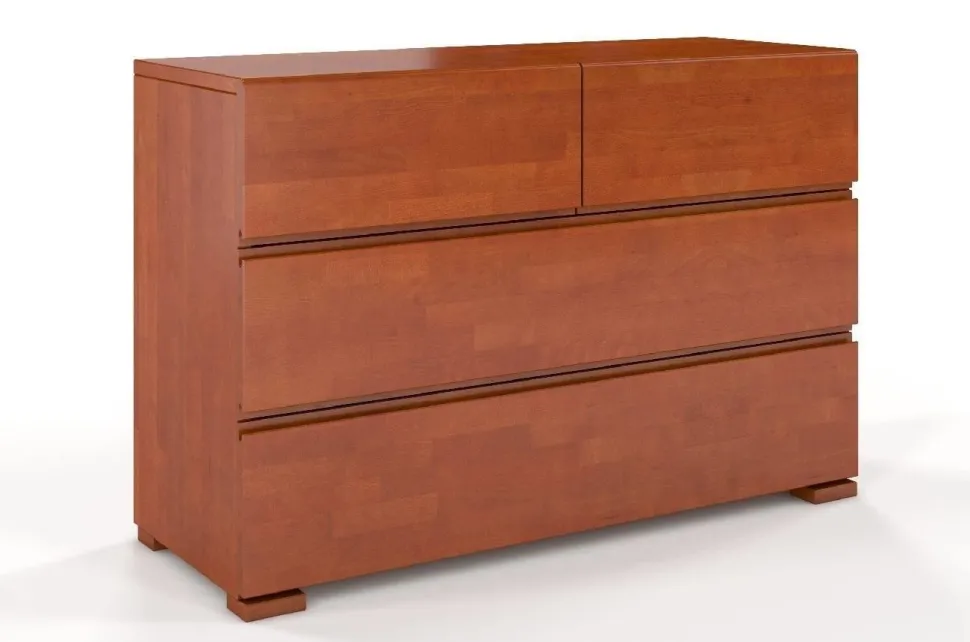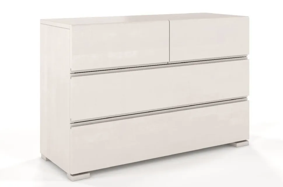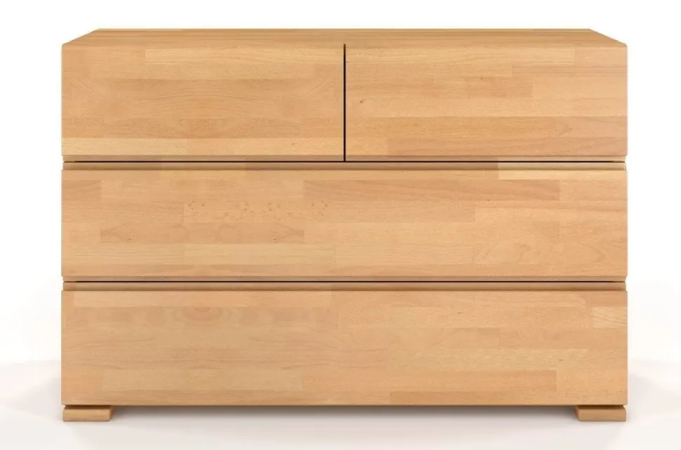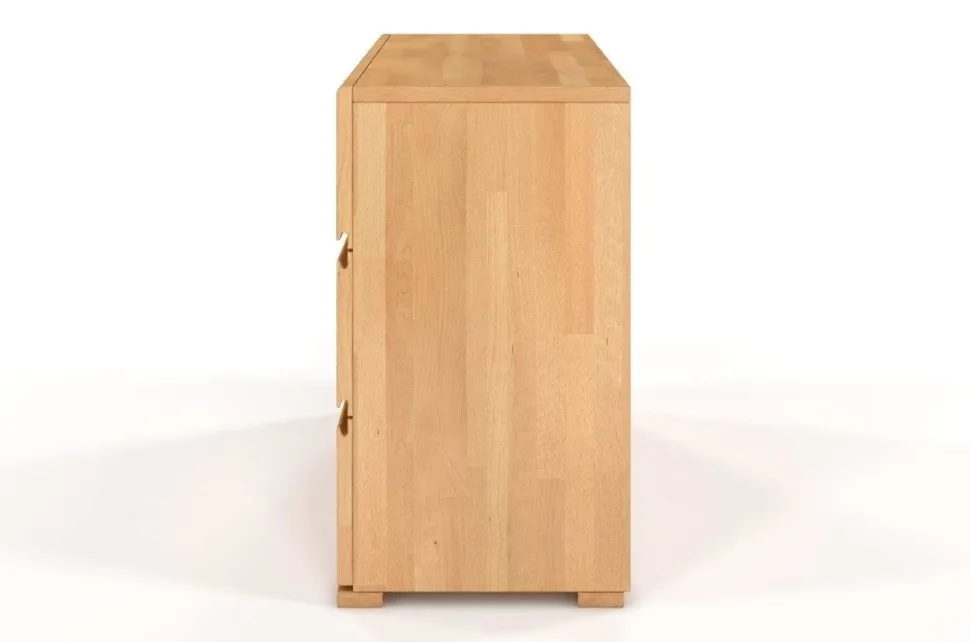 Komoda bukowa Skandica VESTRE z 6 szufladami to perfekcyjnie zgrane połączenie funkcjonalności i doskonałego designu. Zaprojektowana z myślą o nowoczesności, idealnie pasuje właśnie do takich wnętrz. Świetnie komponuje się z meblami z serii VESTRE. Ozdobi sypialnię, salon, przedpokój lub pokój nastolatka. Klasyczne uchwyty w komodzie zastąpiono wycięciami we frontach szuflad. Górna krawędź górnej szuflady – sąsiadująca z blatem – została zaokrąglona, dodając meblowi lekkości. Prowadnice szuflad w komodzie VESTRE wzbogacono o system cichego domyku i hamulce. Dzięki temu szuflady domykają się cicho i miękko, a właściwie same.