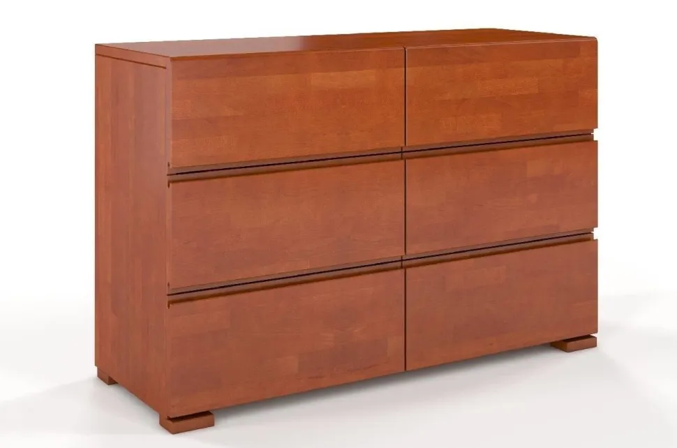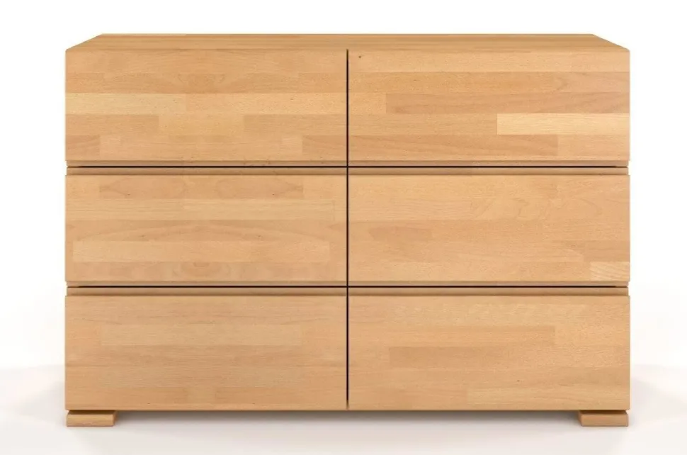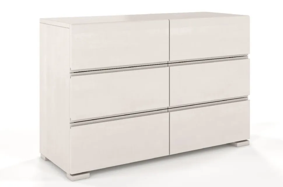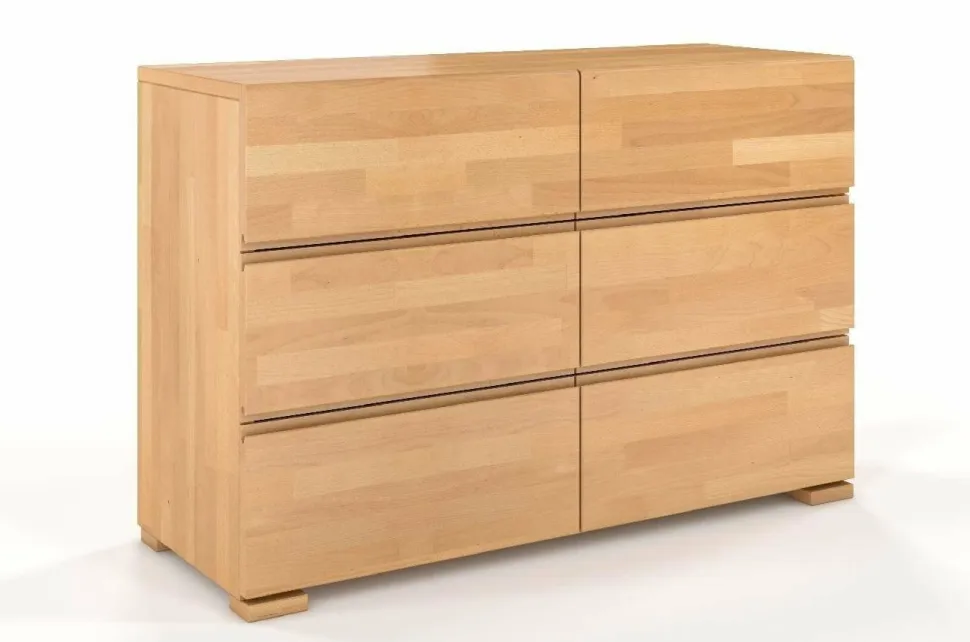 Komoda bukowa Skandica VESTRE z 6 szufladami to perfekcyjnie zgrane połączenie funkcjonalności i doskonałego designu. Zaprojektowana z myślą o nowoczesności, idealnie pasuje właśnie do takich wnętrz. Świetnie komponuje się z meblami z serii VESTRE. Ozdobi sypialnię, salon, przedpokój lub pokój nastolatka. Klasyczne uchwyty w komodzie zastąpiono wycięciami we frontach szuflad. Górna krawędź górnej szuflady – sąsiadująca z blatem – została zaokrąglona, dodając meblowi lekkości. Prowadnice szuflad w komodzie VESTRE wzbogacono o system cichego domyku i hamulce. Dzięki temu szuflady domykają się cicho i miękko, a właściwie same.