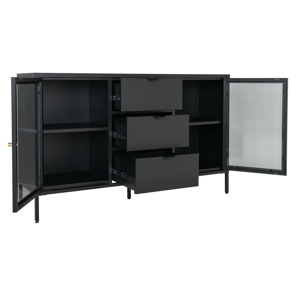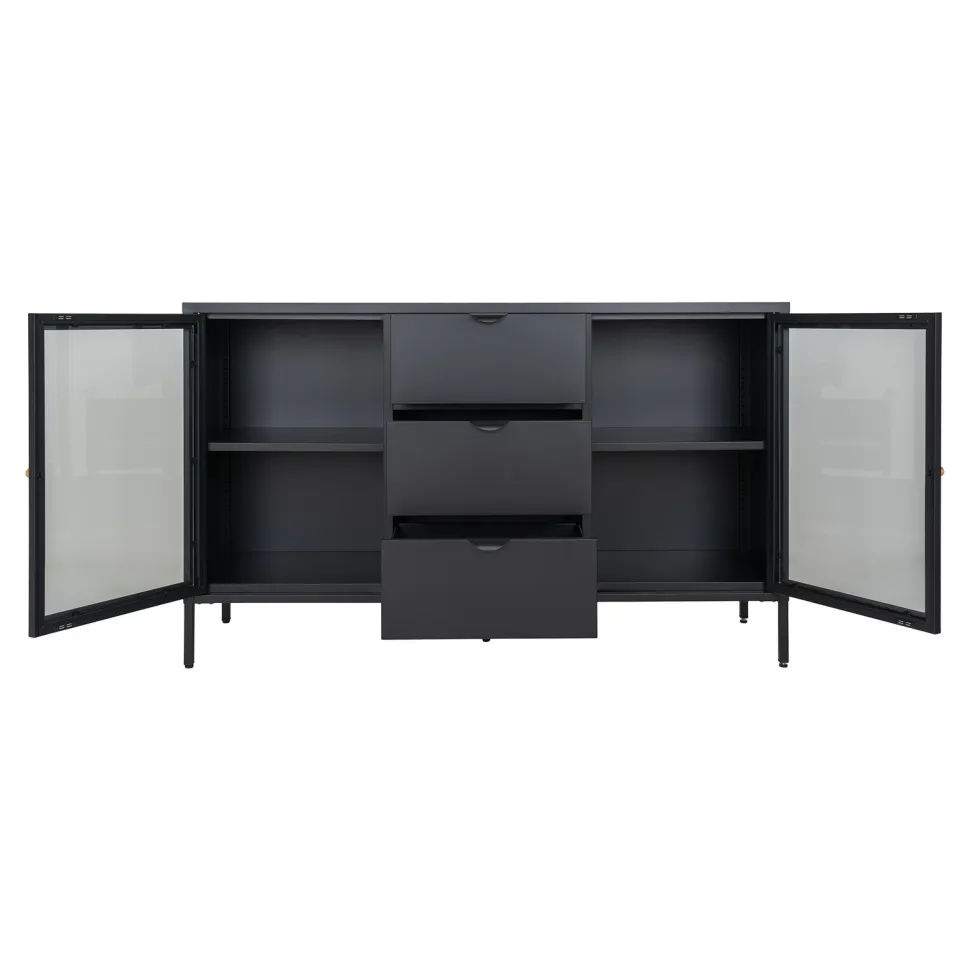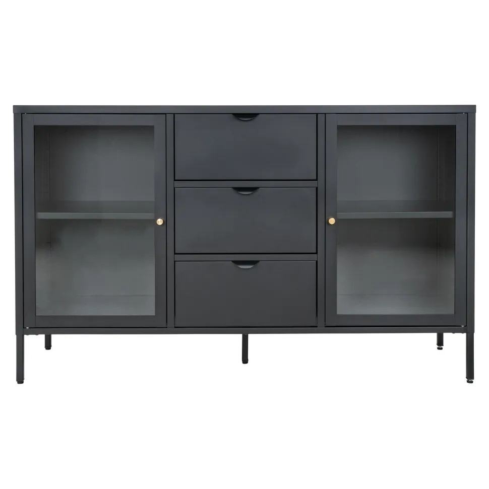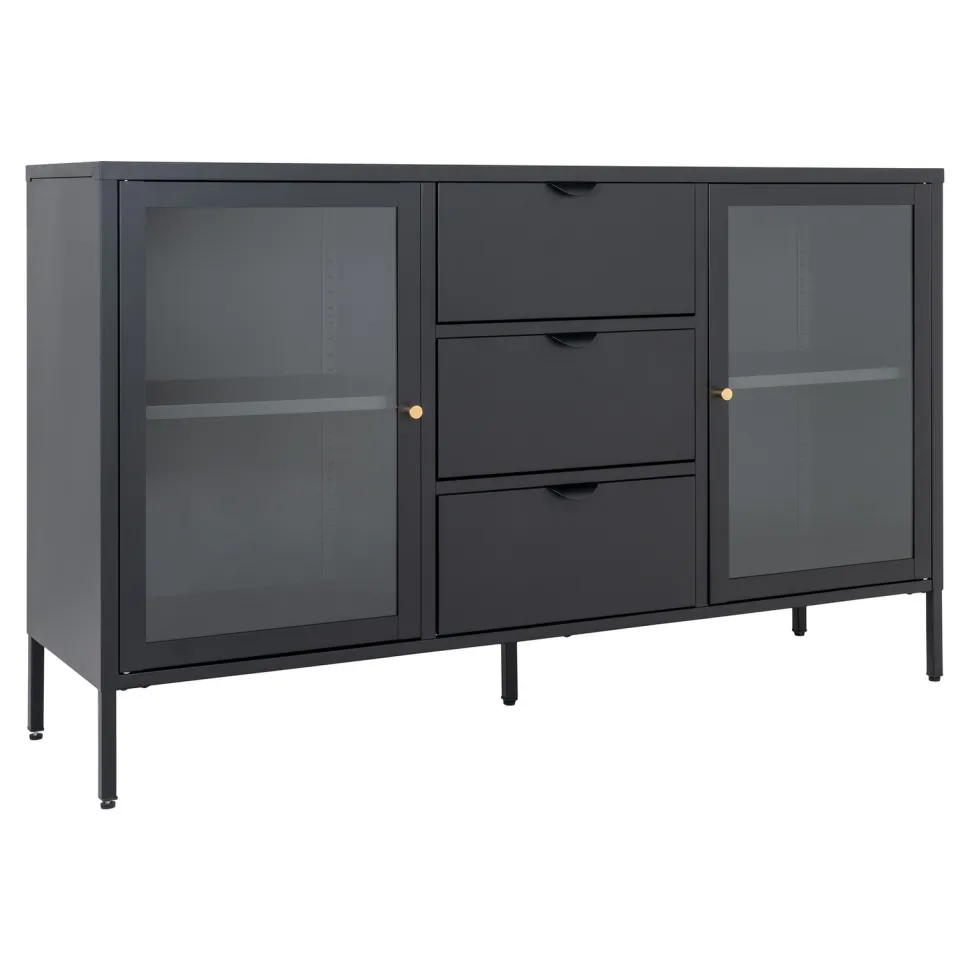 Marka Intesi z dumą prezentuje stalową komodę Dalby. Solidna konstrukcja z pięcioma nogami zapewnia stabilność, a 3 szuflady i 2 drzwi ze szklanymi frontami gwarantują dużo miejsca do przechowywania. Dzięki swojej konstrukcji, komoda jest idealna do przechowywania książek, dokumentów, a także innych drobiazgów, które chcesz mieć pod ręką.