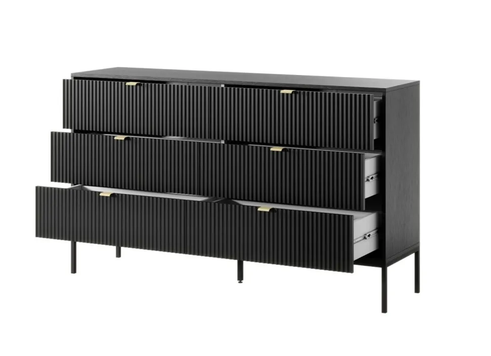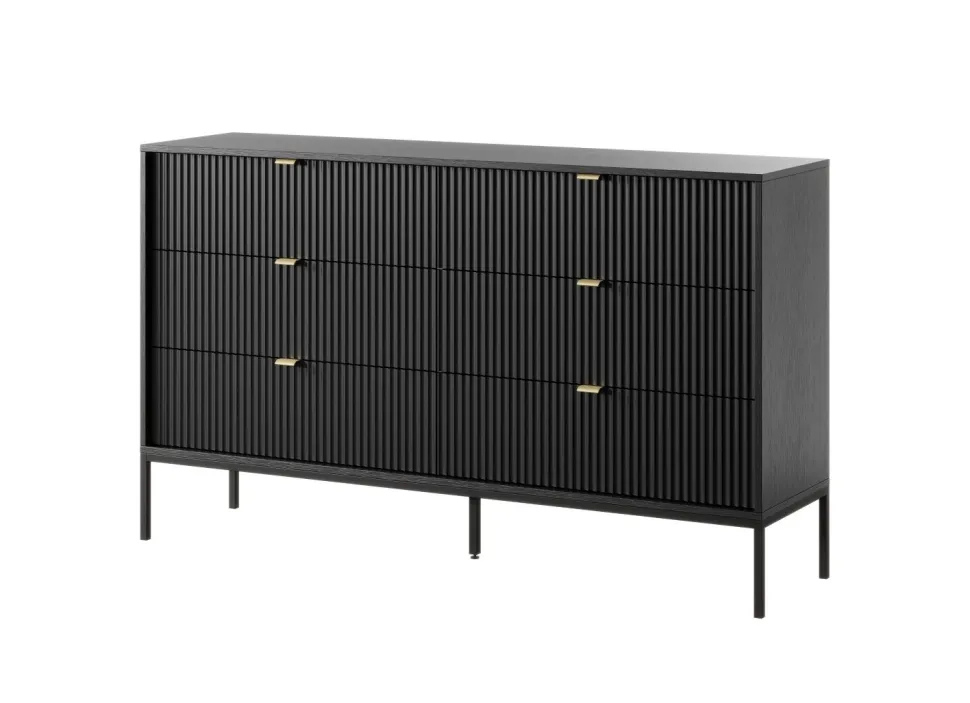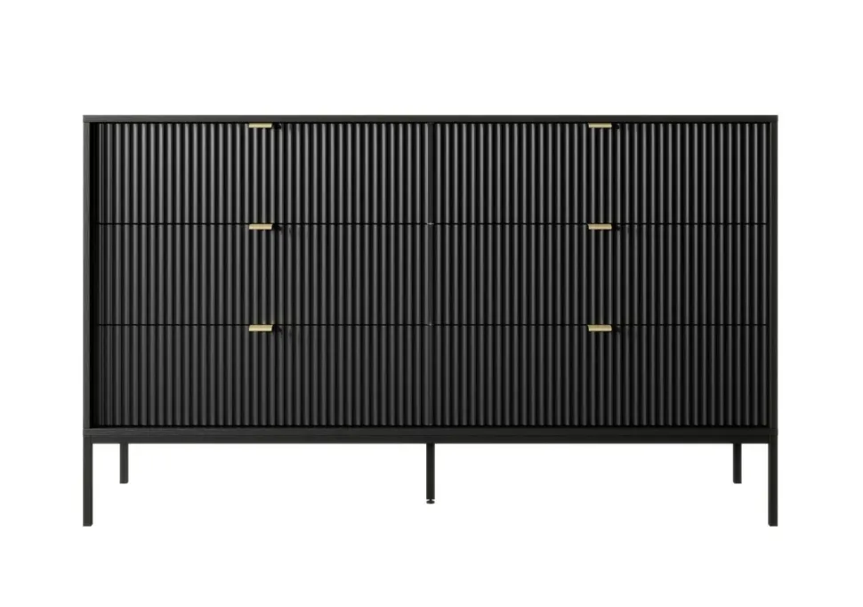 Komoda Delicious 6 szuflad ryflowana czarna to doskonałe połączenie nowoczesnego stylu i praktycznej funkcjonalności. Jej charakterystyczne ryflowane fronty wprowadzają do wnętrza elementy elegancji i wyrafinowania, które doskonale komponują się z różnorodnymi aranżacjami. Złote, aluminiowe uchwyty podkreślają luksusowy charakter mebla, dodając mu subtelnej elegancji. Czarna kolorystyka sprawia, że komoda stanowi efektowny akcent dekoracyjny, który przyciąga wzrok i dodaje wnętrzu wyjątkowego uroku.