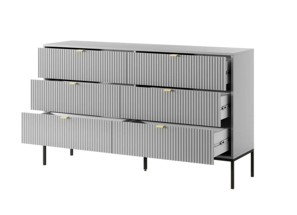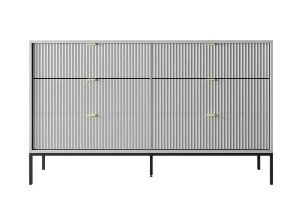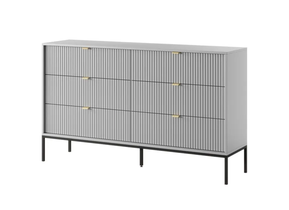 Komoda Delicious 6 szuflad ryflowana szara to mebel, który wprowadza do wnętrza nowoczesny styl i wyjątkowy urok. Jej ryflowane fronty nadają jej charakteru i elegancji, a złote, aluminiowe uchwyty dodają luksusowego akcentu. Szary kolor komody sprawia, że jest to uniwersalny element dekoracyjny, który pasuje do różnych aranżacji wnętrz, wnosząc do nich nutę wyrafinowania.