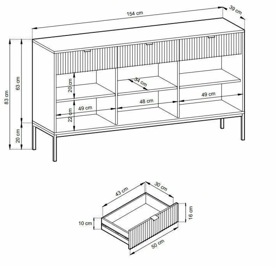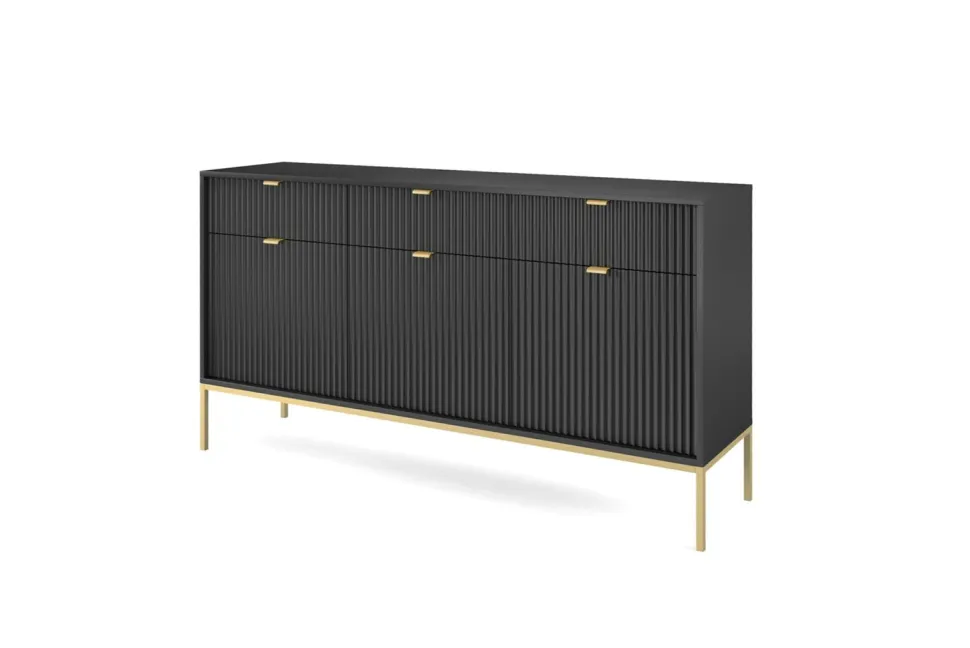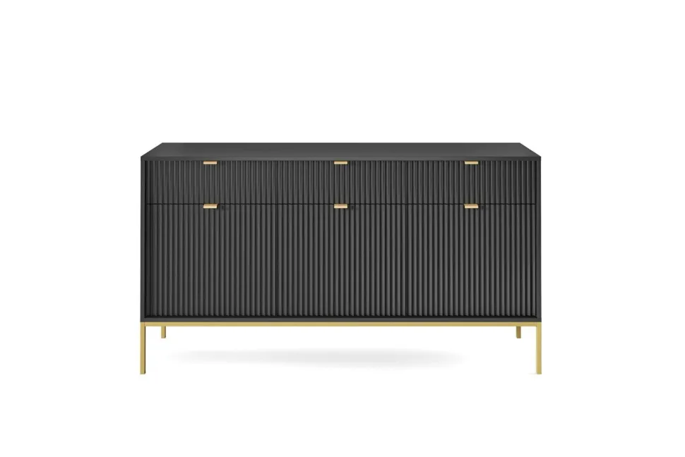 Oszałamiająca komoda z ryflowanymi frontami i stylowymi złotymi uchwytami wniesie wyrafinowanie i urok do każdej przestrzeni. Jej trzy szuflady i trzy szafki oferują dużą pojemność do przechowywania wszystkich rzeczy – od odzieży i biżuterii po sztućce, pamiątki i elektronikę. Co więcej, metalowe nóżki zapewniają długotrwałą stabilność, a także dodatkową wysokość, dzięki czemu można bez wysiłku sięgać w dół lub sprzątać pod nim bez trudności.