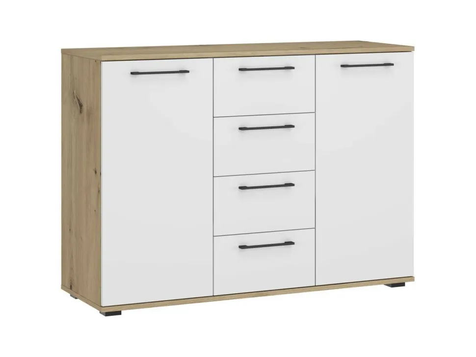 - Połączenie ciepłego odcienia dębu artisan z białymi frontami nadaje komodzie nowoczesny i elegancki wygląd, który łatwo dopasuje się do różnych stylów wnętrzarskich