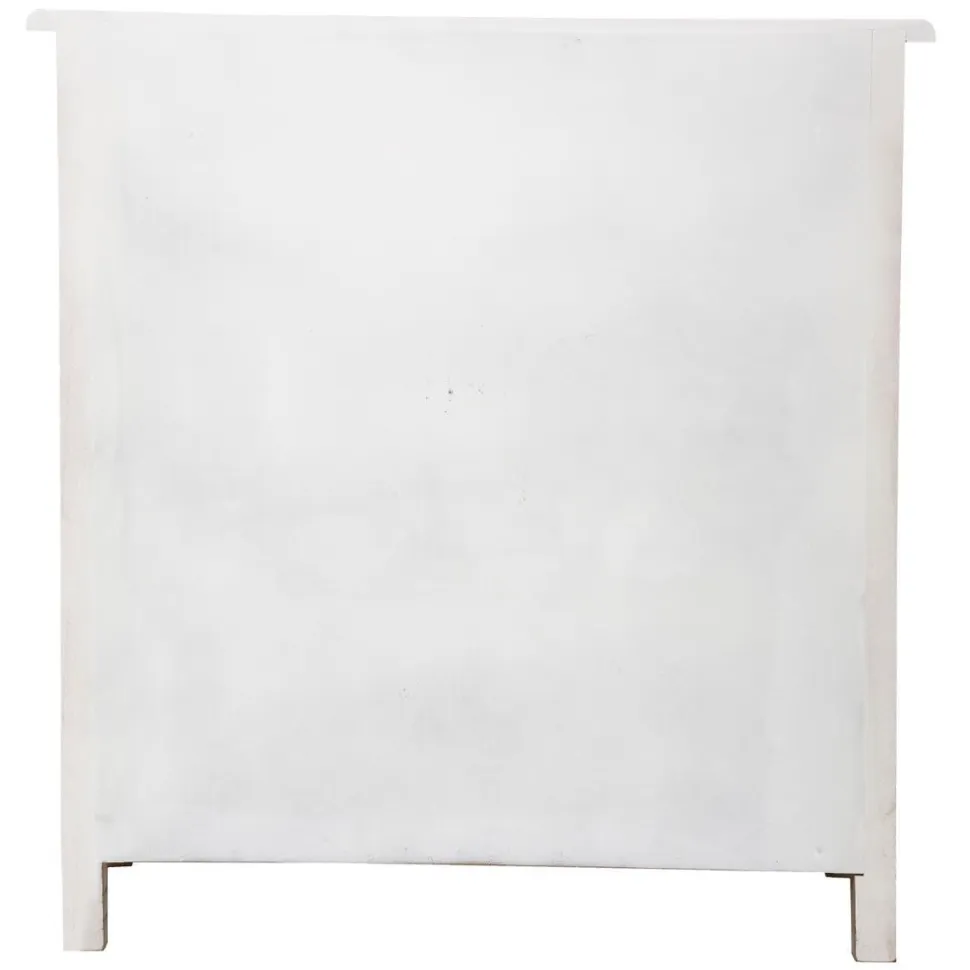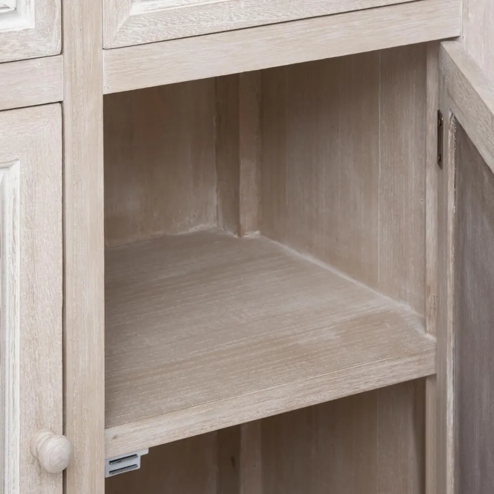 Wyróżniającym elementem Komody Hina bielonej jest wyjątkowe zdobienie inspirowane motywami orientalnymi, które zdobią fronty szuflad i drzwi. Dzięki temu, mebel ten stanowi nie tylko praktyczne, ale i estetyczne dopełnienie wnętrza, wprowadzając do niego nutę egzotyki i elegancji. Dodatkowo, bielone drewno nadaje komodzie lekkości i świeżości, idealnie wpisując się w trend naturalnych, jasnych kolorów.
