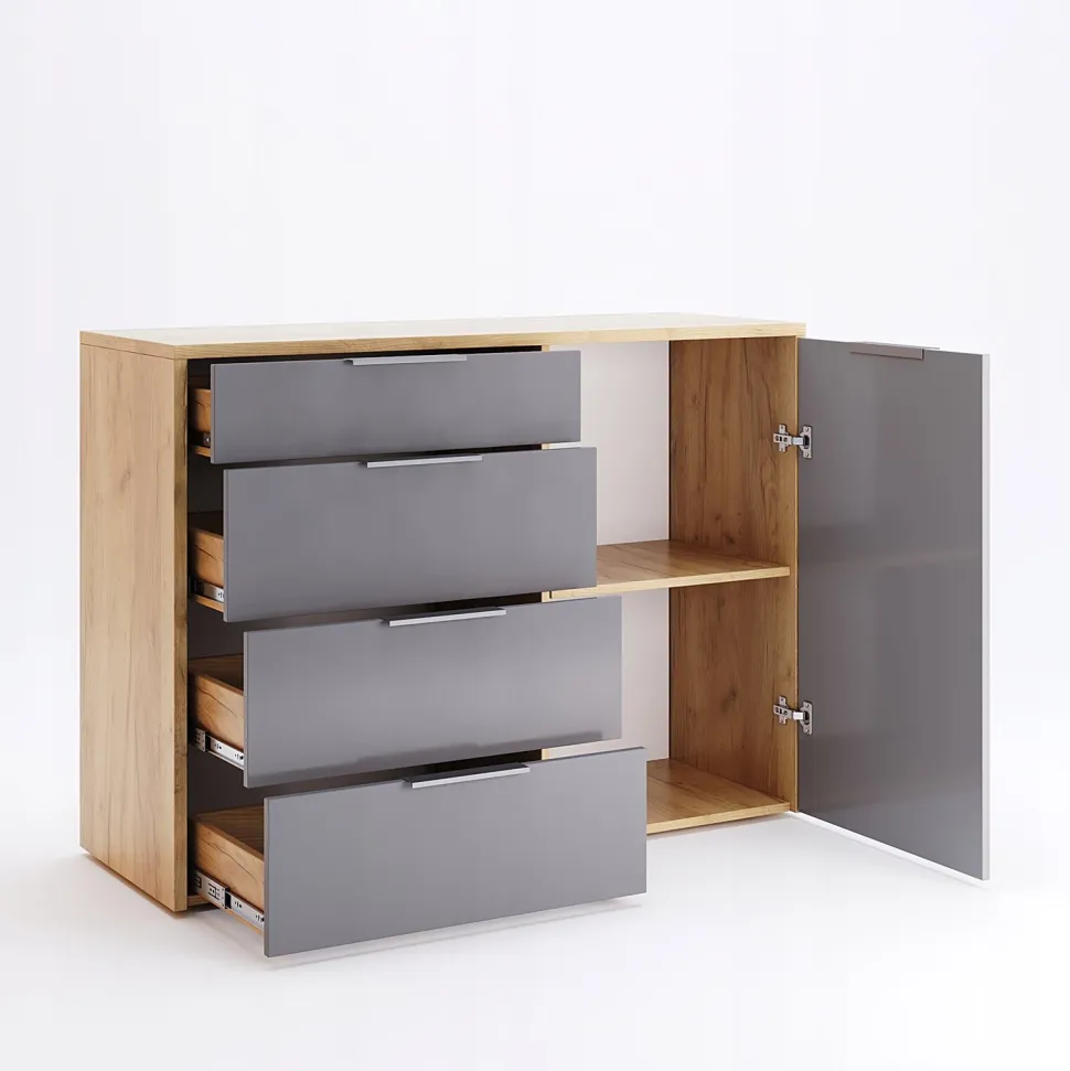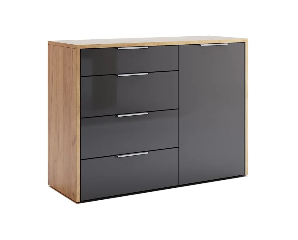 Komoda Lana 120 cm w kolorze dąb/szary to niezbędny element dla urządzenia salonu. Pojemna i wygodna, stanowi idealne rozwiązanie do przechowywania ubrań, czasopism i innych niezbędnych przedmiotów. Jej minimalistyczny design sprawia, że doskonale komponuje się z różnymi aranżacjami wnętrz, dodając im elegancji i funkcjonalności.