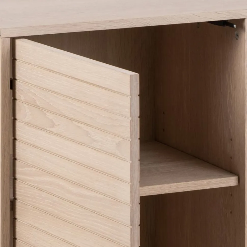 Komoda Linley duża dąb bielony to nie tylko stylowy mebel, ale także niezwykle praktyczny element wyposażenia każdego domu. Cztery regulowane półki umożliwiają przechowywanie różnych przedmiotów, od książek po naczynia, a funkcja push to open sprawia, że otwieranie i zamykanie drzwiczek jest łatwe i bezproblemowe. Bielony dąb dodaje komodzie naturalnego uroku i sprawia, że pasuje do różnych stylów wnętrz.