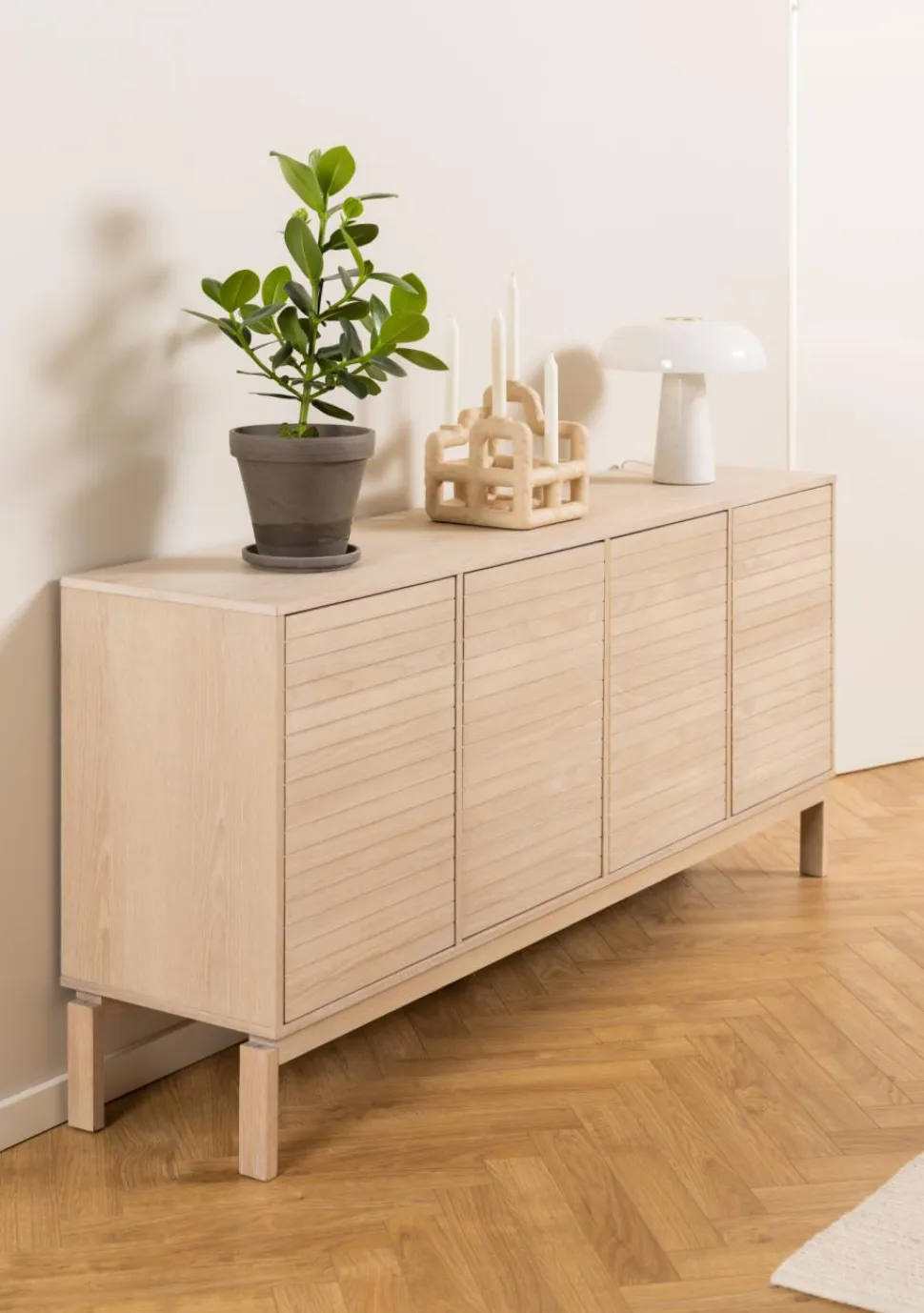 Chcesz łączyć funkcjonalność z wyrafinowanym stylem? Komoda Linley duża dąb bielony to idealny wybór dla Ciebie. Ta przestronna komoda z czterema drzwiczkami i czterema regulowanymi półkami oferuje wiele miejsca do przechowywania, a jej subtelny design sprawia, że idealnie wpasuje się w każde wnętrze, zarówno nowoczesne, jak i tradycyjne. Wykonana z wysokiej jakości materiałów, takich jak płyta MDF i fornir dębowy olejowany pigmentowany na biało, komoda gwarantuje długotrwałość i trwałość. Fronty lamelowe dodają jej ciekawego charakteru, tworząc złudzenie optyczne i dodając elementu zaskoczenia.