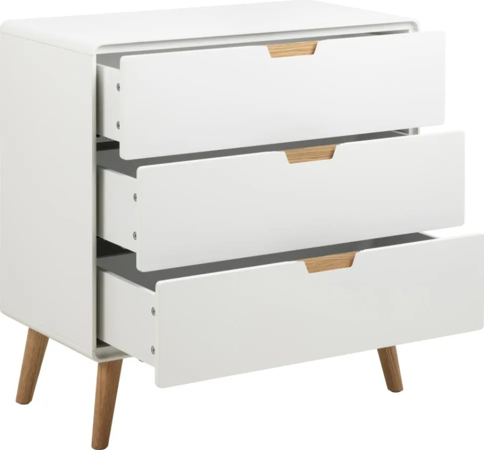 Komoda Lowell z 3 szufladami to połączenie elegancji i funkcjonalności. Wykonana z wysokiej jakości płyty MDF w kolorze białym, z dodatkiem naturalnego dębu, idealnie wpasuje się w każde wnętrze. Komoda zapewnia dużo miejsca do przechowywania różnorodnych przedmiotów, od ubrań, przez zabawki, po książki. Dzięki swojemu minimalistycznemu wyglądowi, będzie pasować do niemal każdego pomieszczenia, niezależnie od jego stylu. Stożkowe nóżki wykonane z drewna dębowego dodają meblowi lekkości i elegancji.