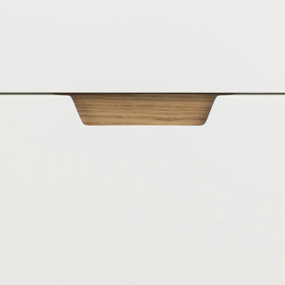 Komoda Lowell to nie tylko stylowy mebel, ale także niezwykle funkcjonalny. Wyposażona w 3 szuflady z cichym domykiem, pozwoli na komfortowe i ciche korzystanie z niej w każdym momencie dnia i nocy. Białe szuflady z dębowymi uchwytami są nie tylko estetyczne, ale także praktyczne – ułatwiają otwieranie i zamykanie.