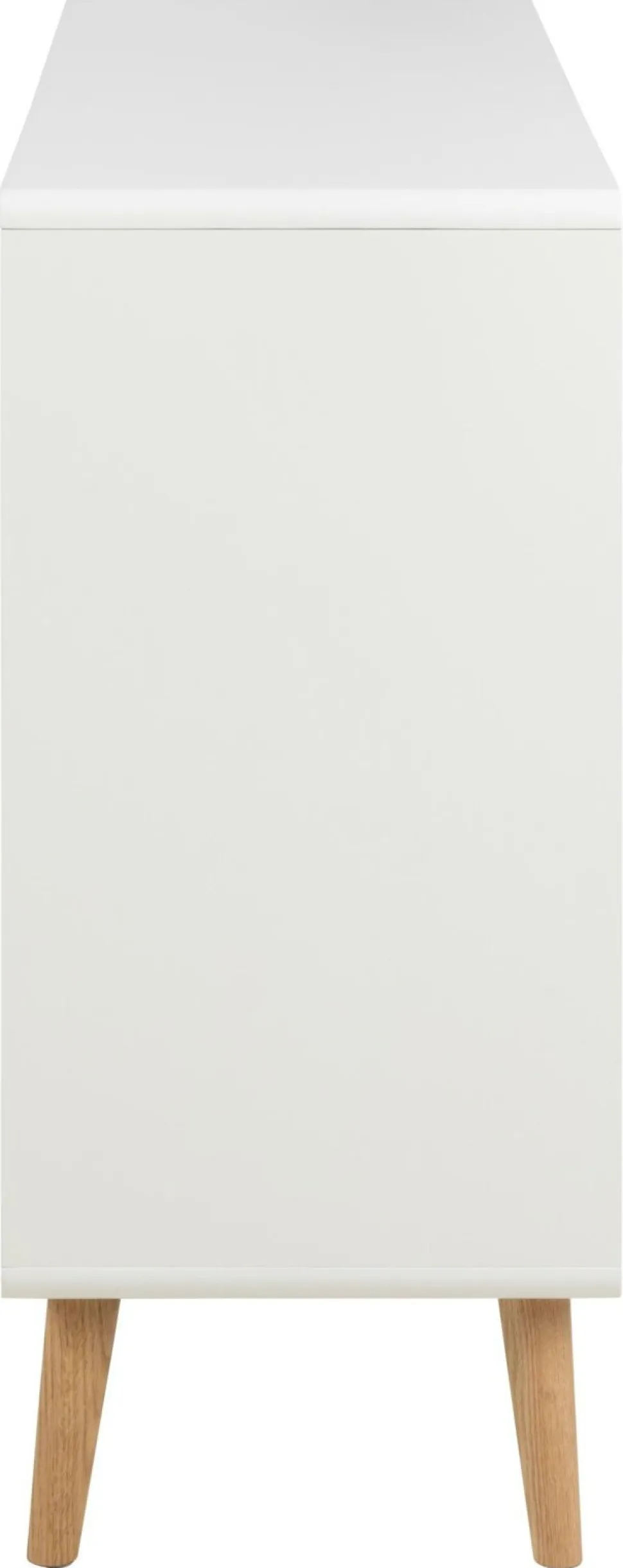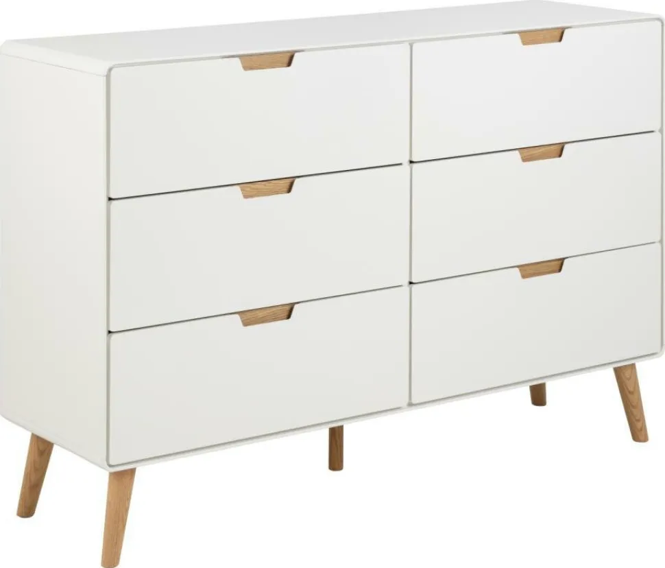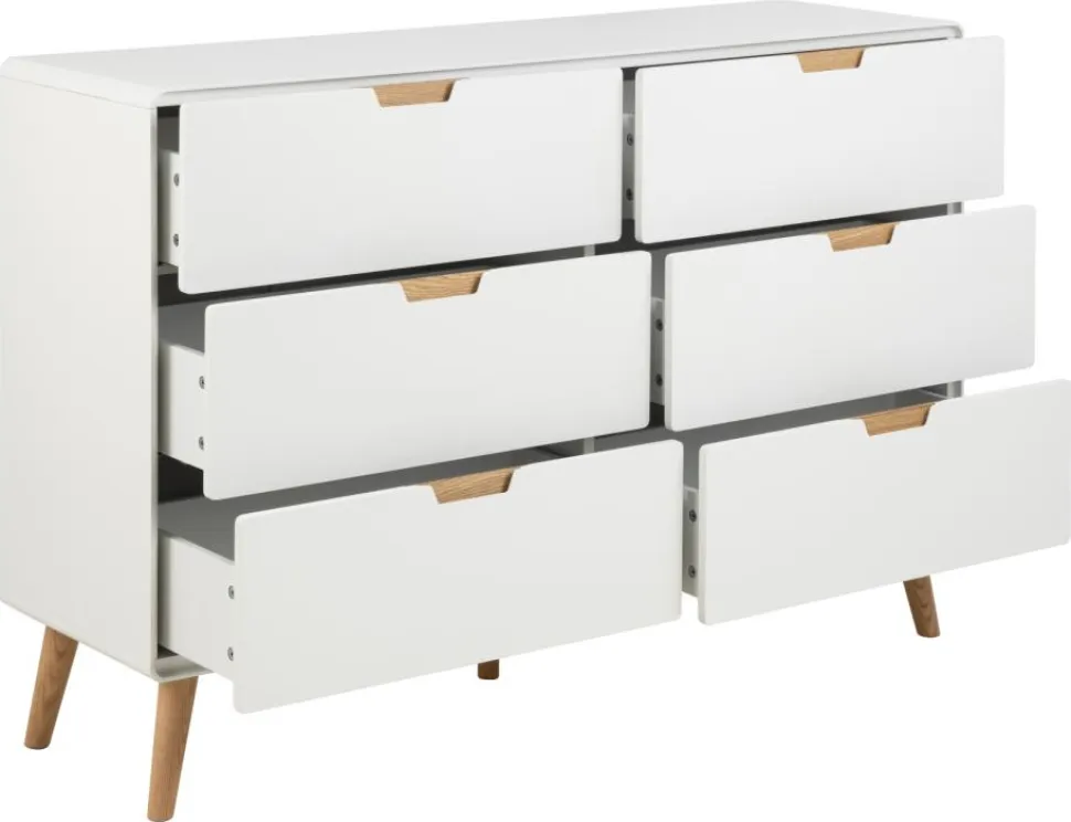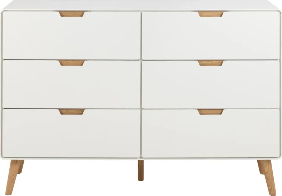 Prezentujemy Państwu komodę Lowell, która swoją prostotą i funkcjonalnością sprawdzi się w każdym pomieszczeniu. Komoda została wykonana z płyty MDF, natomiast nogi komody z solidnego drewna dębowego. Sześć przestronnych szuflad pomalowanych na biało z cichym domykiem umożliwia wygodne przechowywanie ubrań, zabawek czy książek. Stożkowe nogi z dębu dodają meblowi lekkości i elegancji. Biała komoda z dębowymi elementami doskonale wpasuje się w każde wnętrze, nadając mu skandynawskiego charakteru.