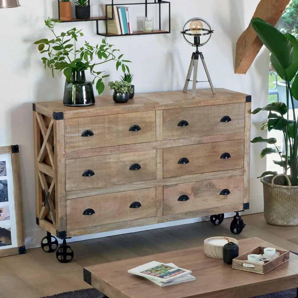 Zaprezentuj swoje wnętrze w wyjątkowym stylu, dodając do niego komodę Silas Mango od marki Atmosphera. Ten mebel, łączący w sobie retro i industrialny styl, z pewnością przyciągnie uwagę gości. Komoda wykonana jest z wytrzymałego drewna mango, które gwarantuje długowieczność i odporność na uszkodzenia. Sześć przestronnych szuflad na metalowych kołach zapewnia dużo miejsca na przechowywanie różnego rodzaju przedmiotów.