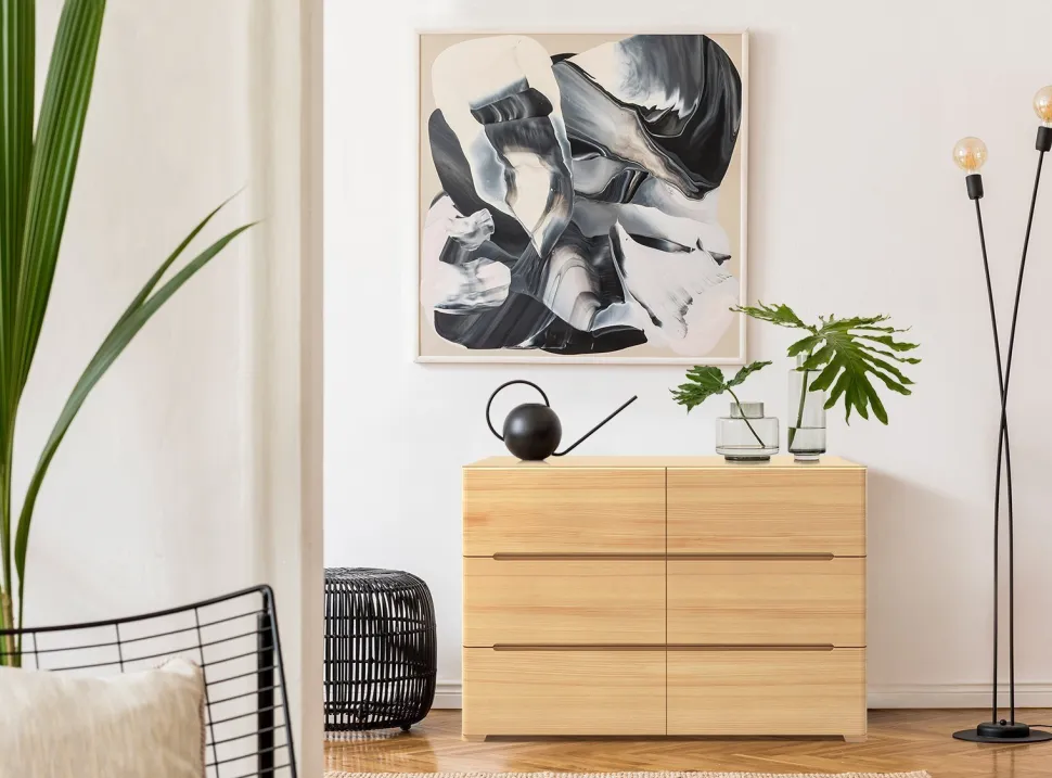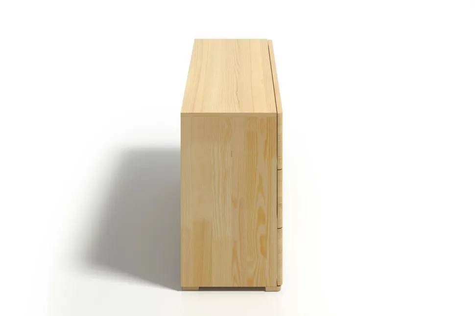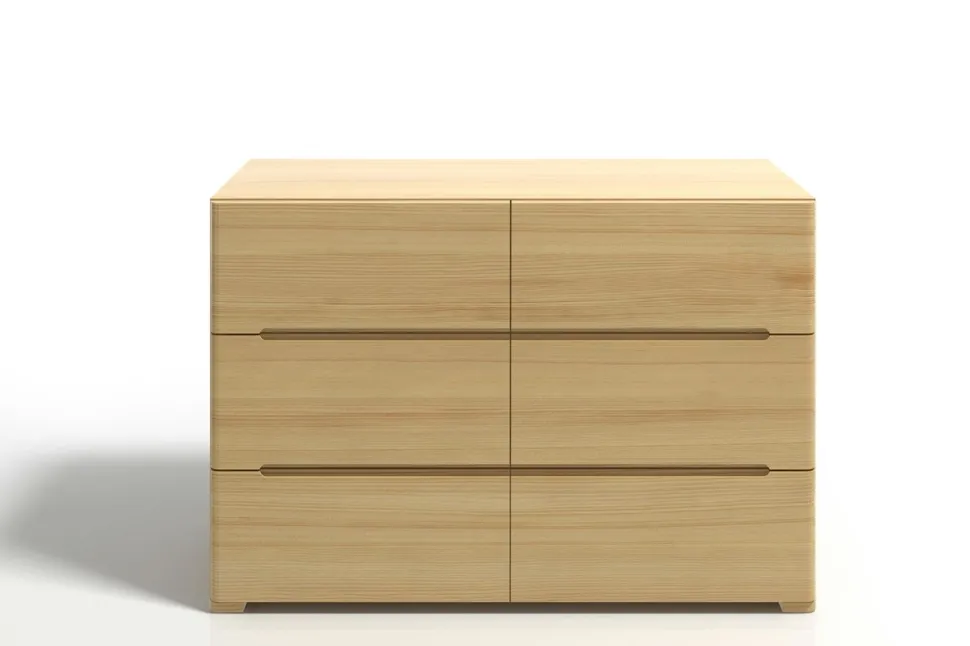 Komoda SPARTA wspiera się na subtelnych, ale niezwykle mocnych nogach, które dbają o jej stabilność. Narożniki nóg i boczne krawędzie komody zostały zaokrąglone, dodając opływowego kształtu i lekkości, jednocześnie podnosząc bezpieczeństwo mebla. Górny blat jest prosty i pozbawiony zdobień, dzięki temu stanowi kolejną powierzchnię, którą można dodatkowo zagospodarować.Szuflady komody SPARTA posiadają system cichego domyku i hamulec. Zastosowane rozwiązanie sprawia, że szuflada zwalnia podczas ostatniego etapu zamykania, domykając się cicho i miękko. Aby pogodzić wizualną skromność modelu i użytkową potrzebę wygody, uchwyty to frezowane wycięcia w krawędziach szuflad (górna krawędź dolnej szuflady, dolna i górna środkowej oraz dolna krawędź górnej szuflady).Materiał: lite drewno sosnoweSzuflady: 6Dno szuflady: płytaProwadnice: z systemem cichego domyku i hamulcem