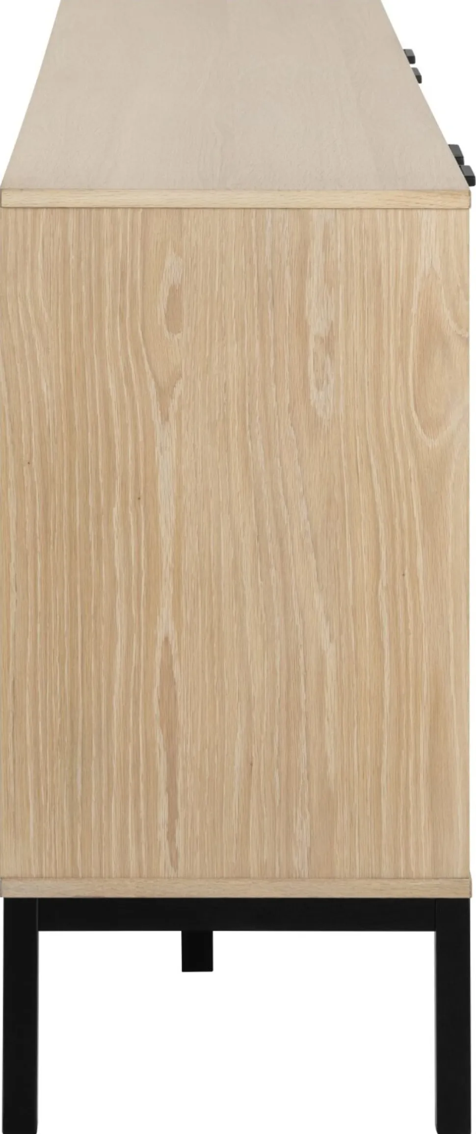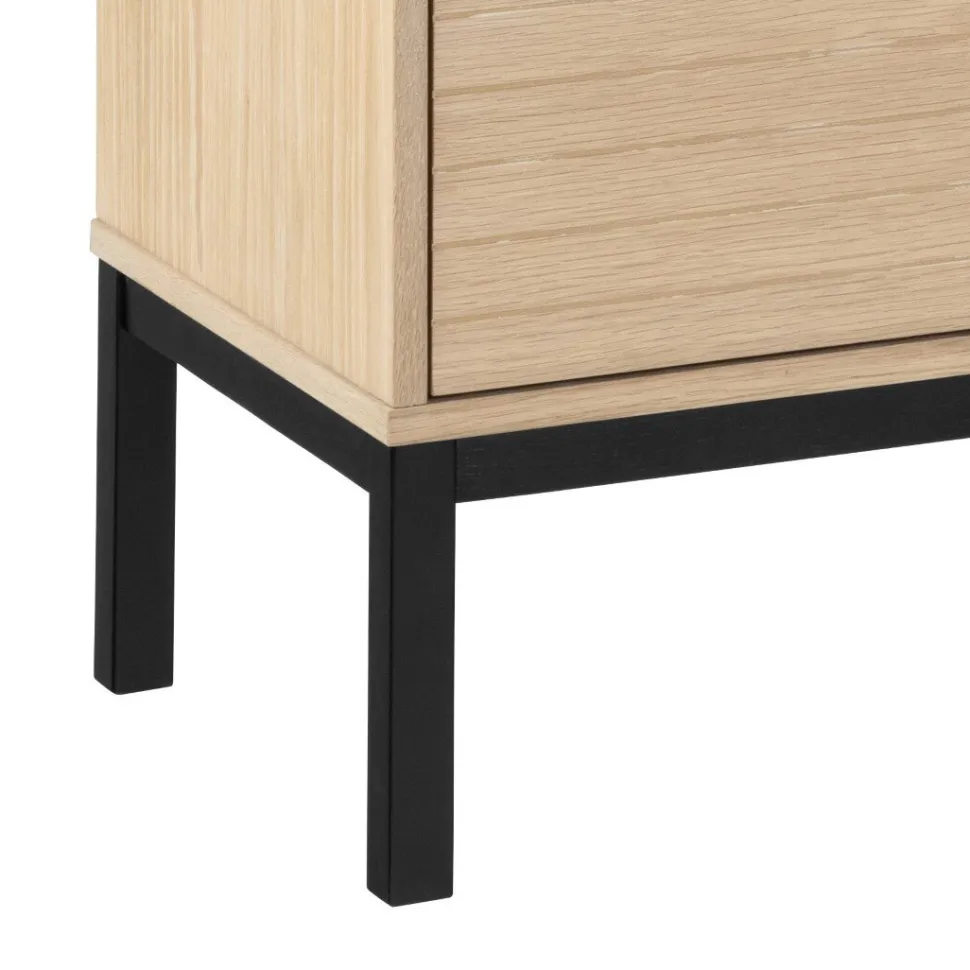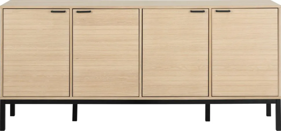 Prezentujemy elegancką i funkcjonalną komodę Kensington w odcieniu dębu bielonego. Nowoczesna szafka, wykonana z wysokiej jakości płyty MDF oraz forniru dębowego, z pewnością ożywi każde pomieszczenie. Cztery drzwi z dekoracyjnymi lamelami skrywają regulowane półki, umożliwiając efektywne wykorzystanie przestrzeni. Metalowa podstawa dodaje meblowi stabilności, a jej czarny kolor idealnie kontrastuje z jasnym wykończeniem szafki.