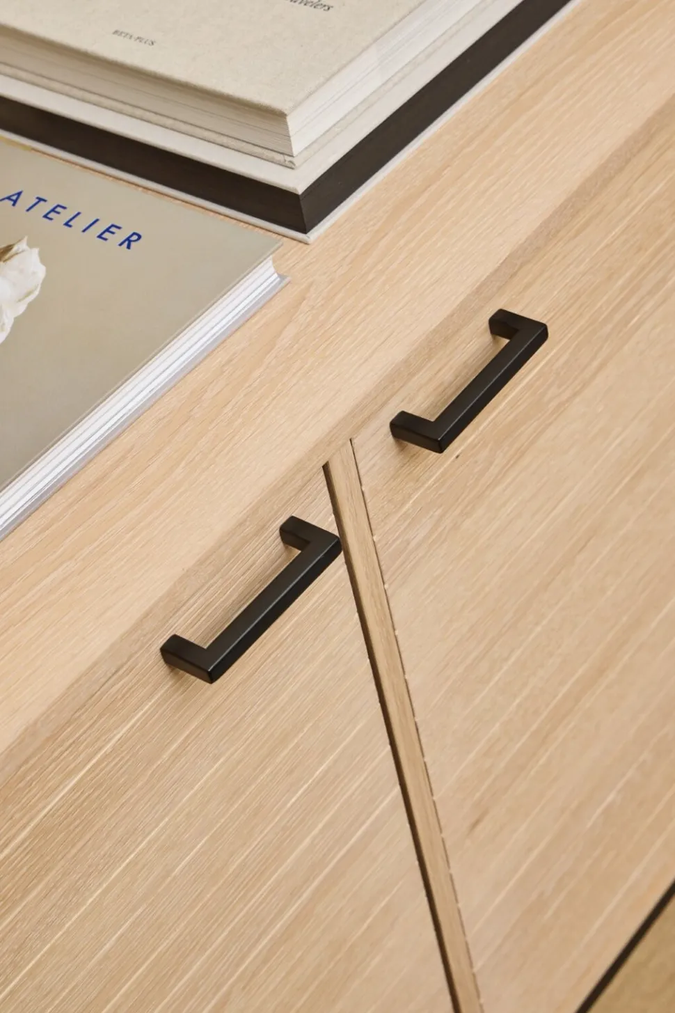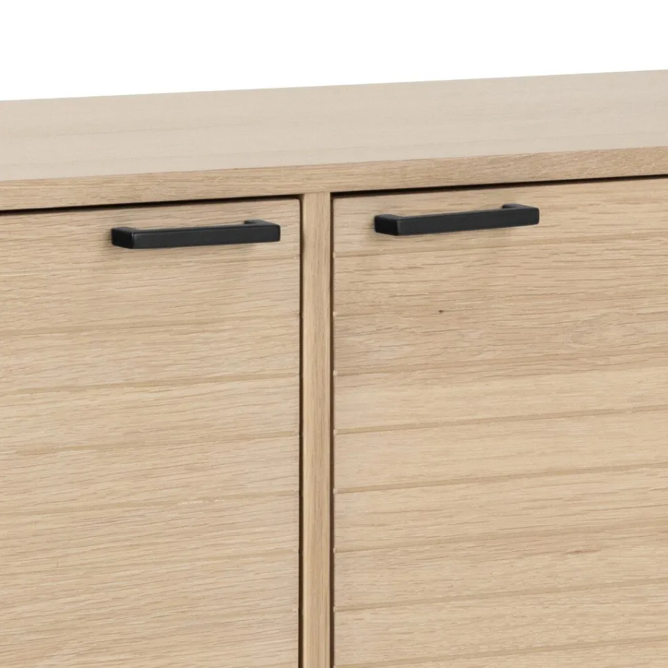 - Szafka posiada cztery drzwi z dekoracyjnymi lamelami, za którymi skrywają się regulowane półki. To rozwiązanie umożliwia efektywne wykorzystanie przestrzeni i pomaga utrzymać porządek.
