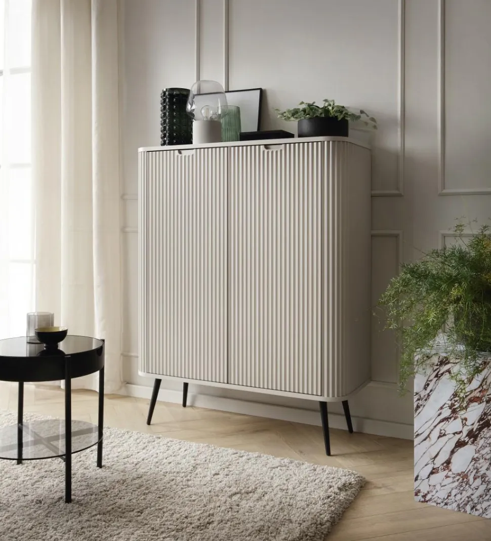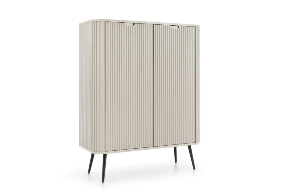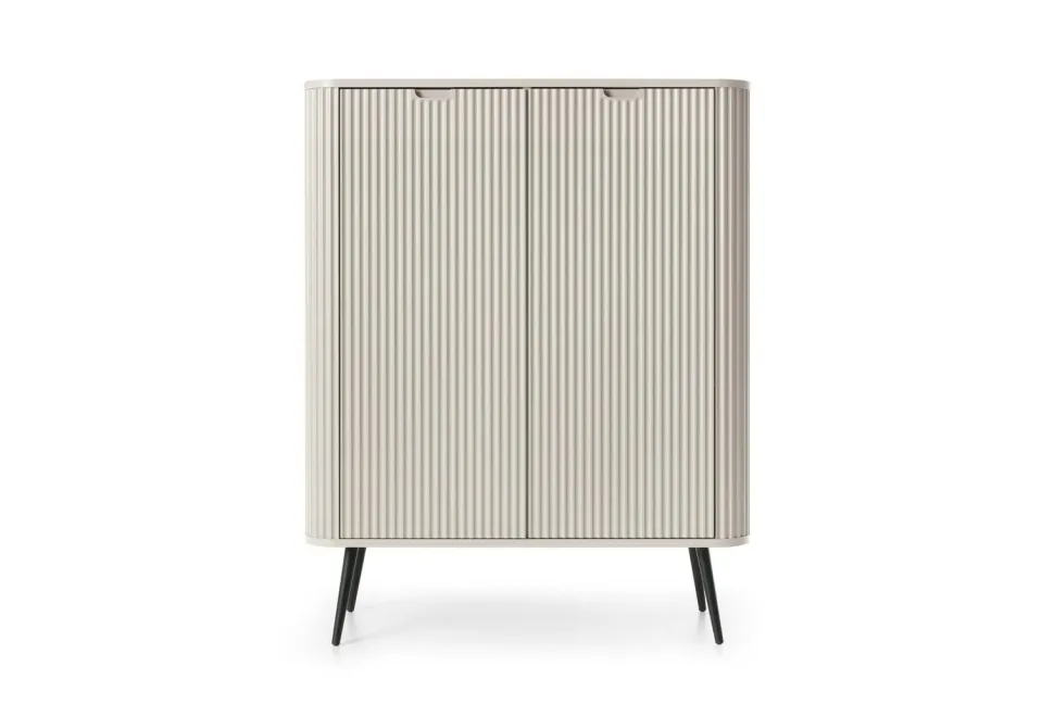 - Estetyczny wygląd komody dzięki frezowanym detalom, metalowym uchwytom i nóżkom nadaje wnętrzu elegancki i nowoczesny charakter