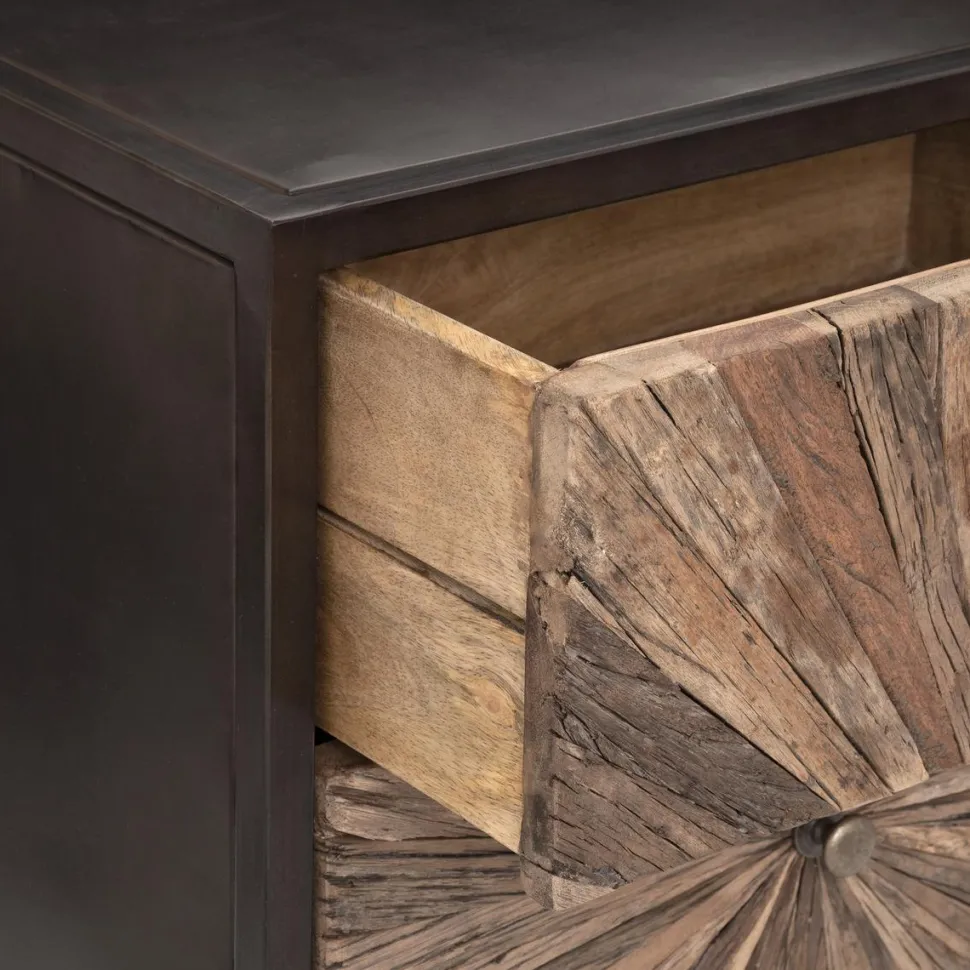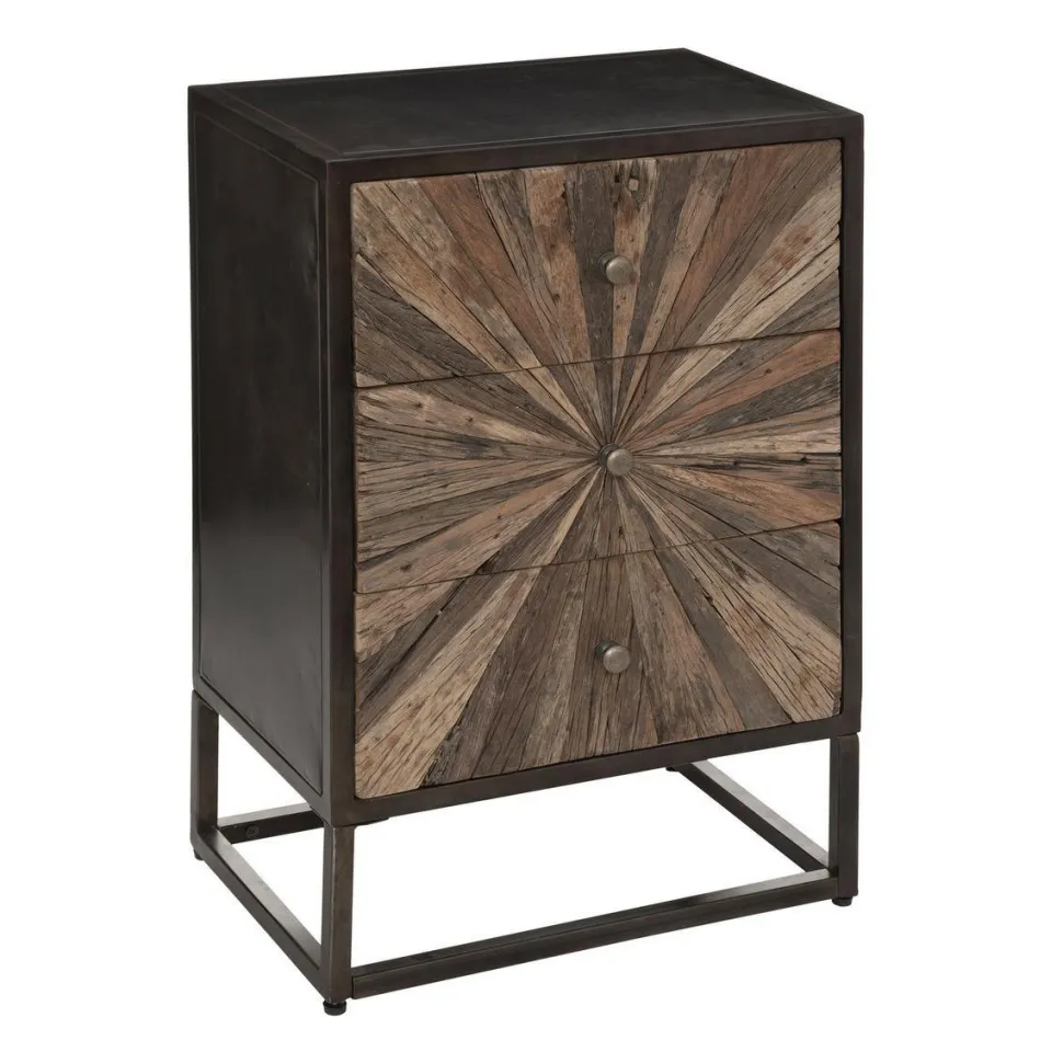 Komoda Origins z 3 szufladami to stylowy i niebanalny mebel. Zarówno czarna metalowa podstawa, jak i korpus wykonany z desek sklejkowych są przyjazne dla środowiska, natomiast unikalne fronty komody zostały wykonane z drewna pochodzącego z recyklingu. Ta wyjątkowa komoda doda charakteru każdemu pomieszczeniu.