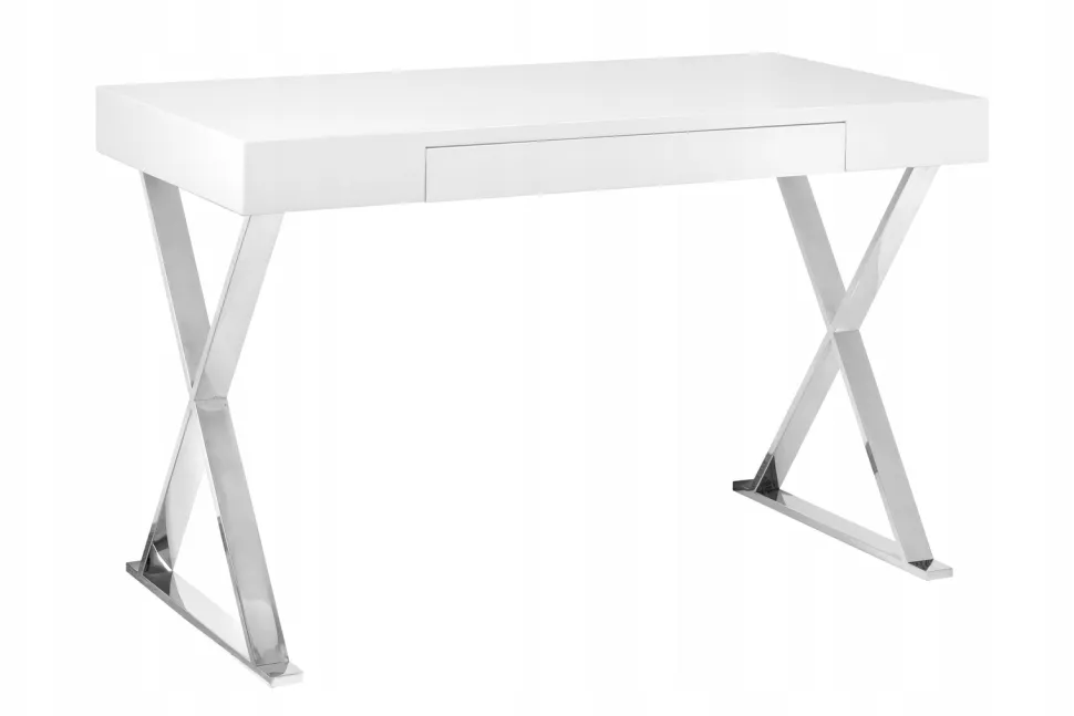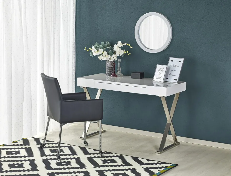 Konsola/ biurko Galati- nowoczesna elegancja Konsola/Biurko Galati to znakomity przykład połączenia funkcjonalności i estetyki, której wyjątkowy design wzbogaci każde wnętrze. O wymiarach 120/55/76 cm, ten mebel MDF lakierowany na wysoki połysk nie tylko przyciąga uwagę, ale także wzbogaca przestrzeń o wyrafinowany styl. Biały kolor kontrastuje z elegancką stalą chromowaną, która tworzy unikalną podstawę w formie skrzyżowanych płóz. Konsola/Biurko Galati to nie tylko mebel, to również funkcjonalność w jednym miejscu. Szuflada stanowi doskonałe miejsce do przechowywania drobnych przedmiotów, zapewniając porządek i wygodę Jej wyjątkowa forma skrzyżowanych płóz dodaje charakteru oraz stanowi niebanalny element dekoracyjny. To mebel wielofunkcyjny – doskonale sprawdzi się jako konsola, toaletka lub proste biurko, dopasowując się do Twoich potrzeb. Styl Galati to połączenie nowoczesności i glamour, co sprawia, że ten mebel idealnie wkomponuje się w różnorodne aranżacje wnętrz. Bez względu na to, czy stanie w salonie, sypialni czy przedpokoju, przyciągnie spojrzenia swoją wyjątkową prezencją. O tym warto pamiętać! Konsola/Biurko Galati to połączenie wysokiego połysku i chromowanej stali, tworzące elegancką kompozycję. Posiadając 1 szufladę, mebel oferuje praktyczną przestrzeń do przechowywania. Wyjątkowa podstawa w formie skrzyżowanych płóz nadaje meblowi charakteru i unikalności. Mebel może pełnić rolę konsoli, toaletki lub prostego biurka, dostosowując się do różnorodnych potrzeb. Wyjątkowe połączenie materiałów i designu sprawia, że Galati idealnie komponuje się w nowoczesnych i glamour wnętrzach, nadając im wyjątkowej elegancji.