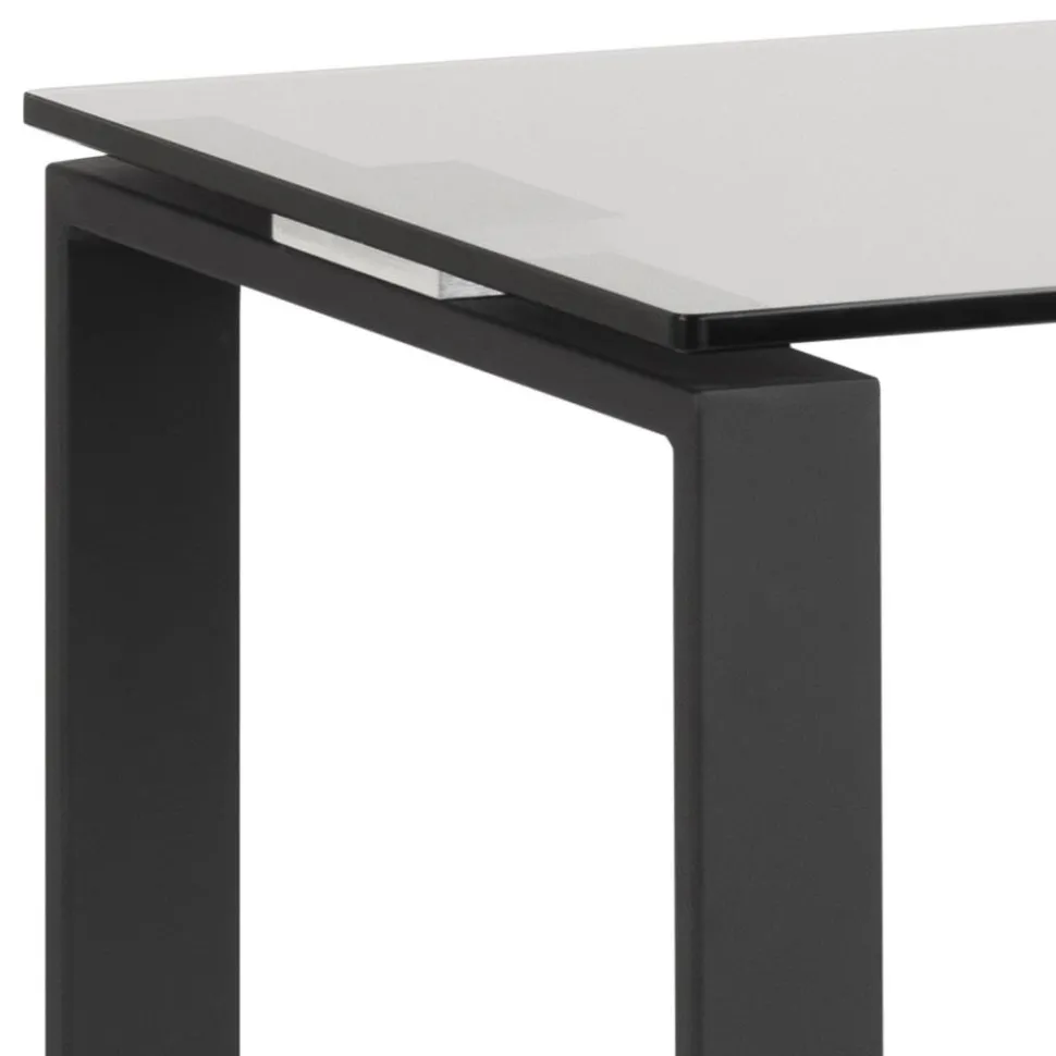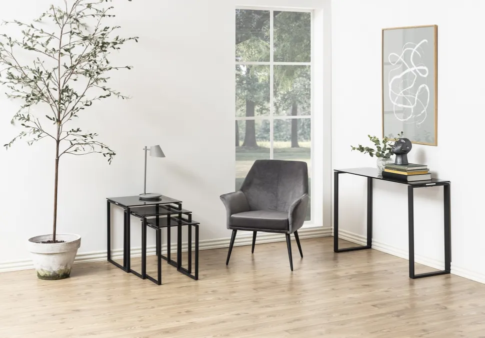 Konsola Katrine jest kwintesencją stylu industrialnego. Jej wykończenie na wysoki połysk sprawia, że wygląda ona bardzo nowocześnie. Szklany dymiony blat konsoli został posadowiony na metalowej pomalowanej na czarno ramie. Stolik konsolowy bardzo dobrze komponuje się w otoczeniu luster. Waga: 16,2 kg.