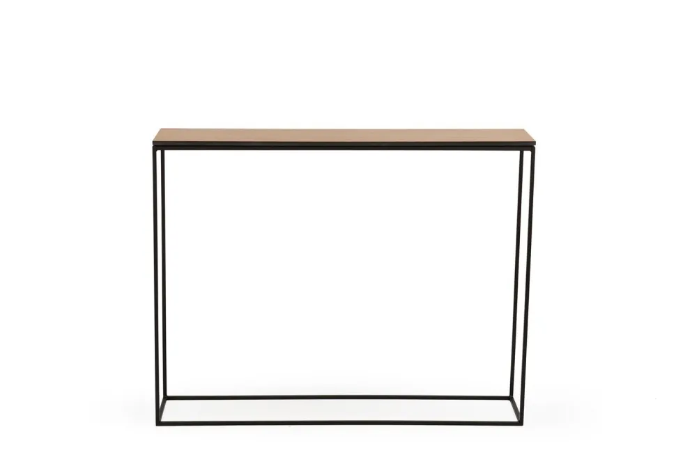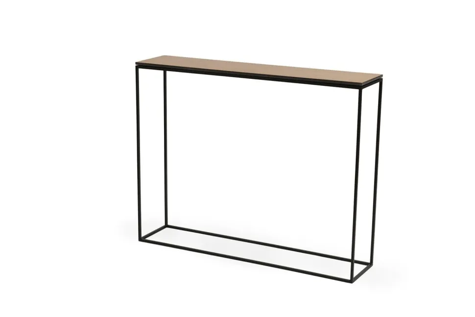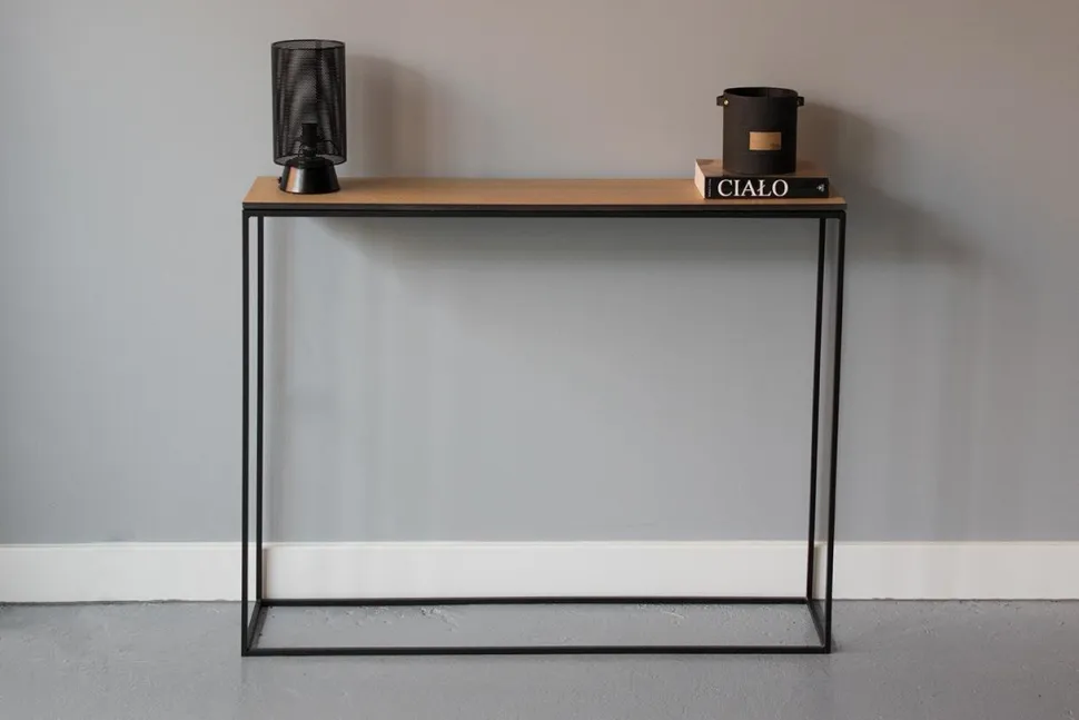 Jedną z najważniejszych cech stylu skandynawskiego je zachowanie równowagi. Kolejną jest połączenie z naturą widoczne w materiałach wykorzystywanych do produkcji mebli. Naturalny dębowy blat i stelaż w postaci ramy łączą te dwie cechy w genialny sposób. WYMIARY: Wysokość: 78 cm Głębokość: 22 cm Szerokość: 100cm MATERIAŁ: Metal, malowany proszkowo. Blat z naturalnym fornirem dębowym. Waga: 9,5,
