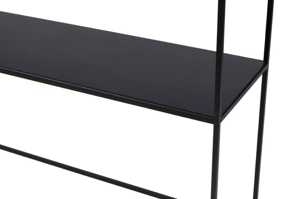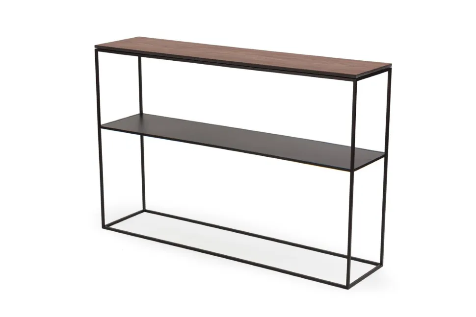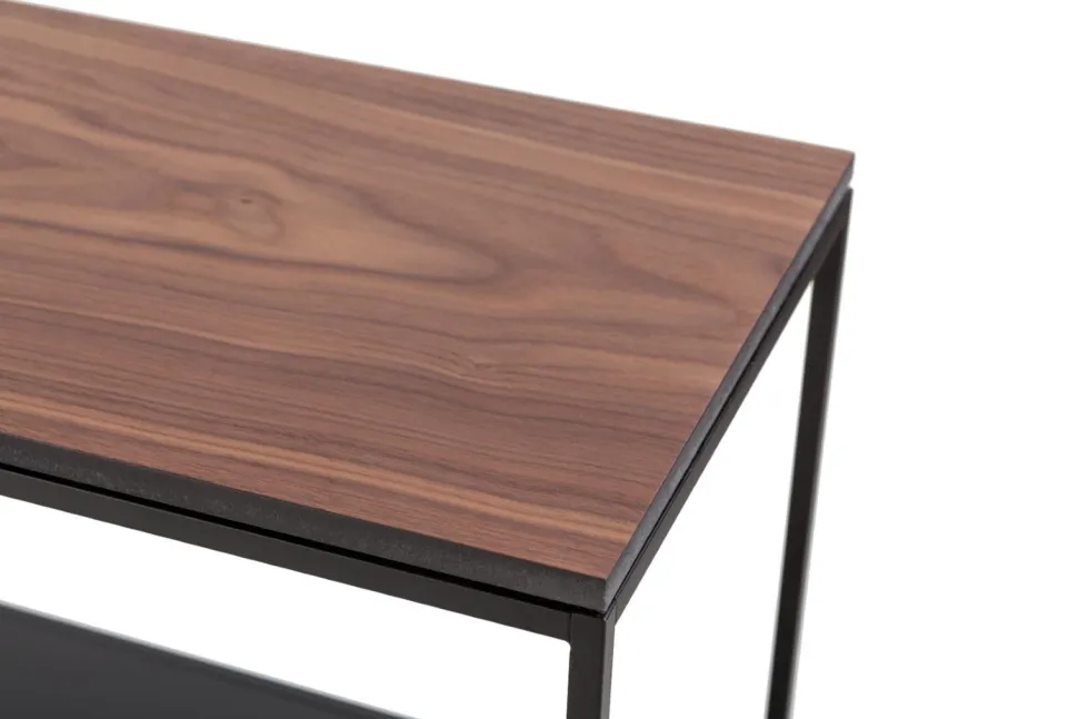 Bazę konsoli stanowi metalowa konstrukcja lakierowana na czarno. Na niej opiera się podłużny, prostokątny blat z płyty MDF pokrytej naturalnym fornirem w kolorze orzecha amerykańskiego. Jego powierzchnia została polakierowana, aby zapewnić dodatkową ochronę.