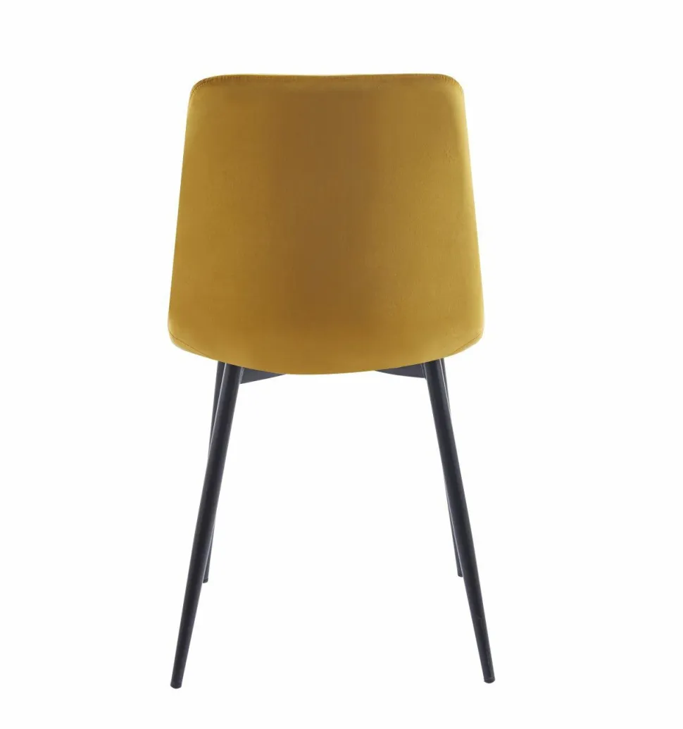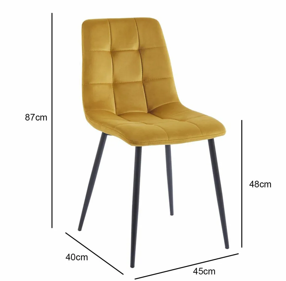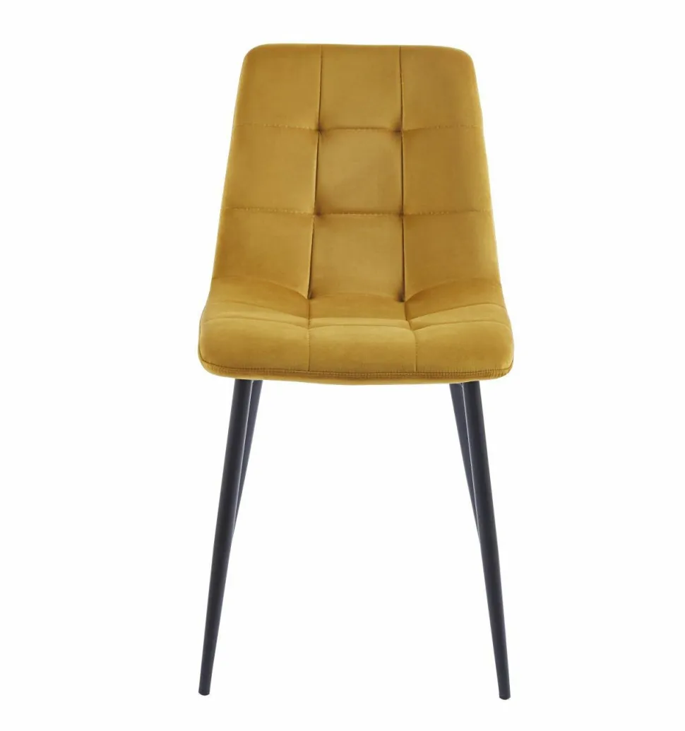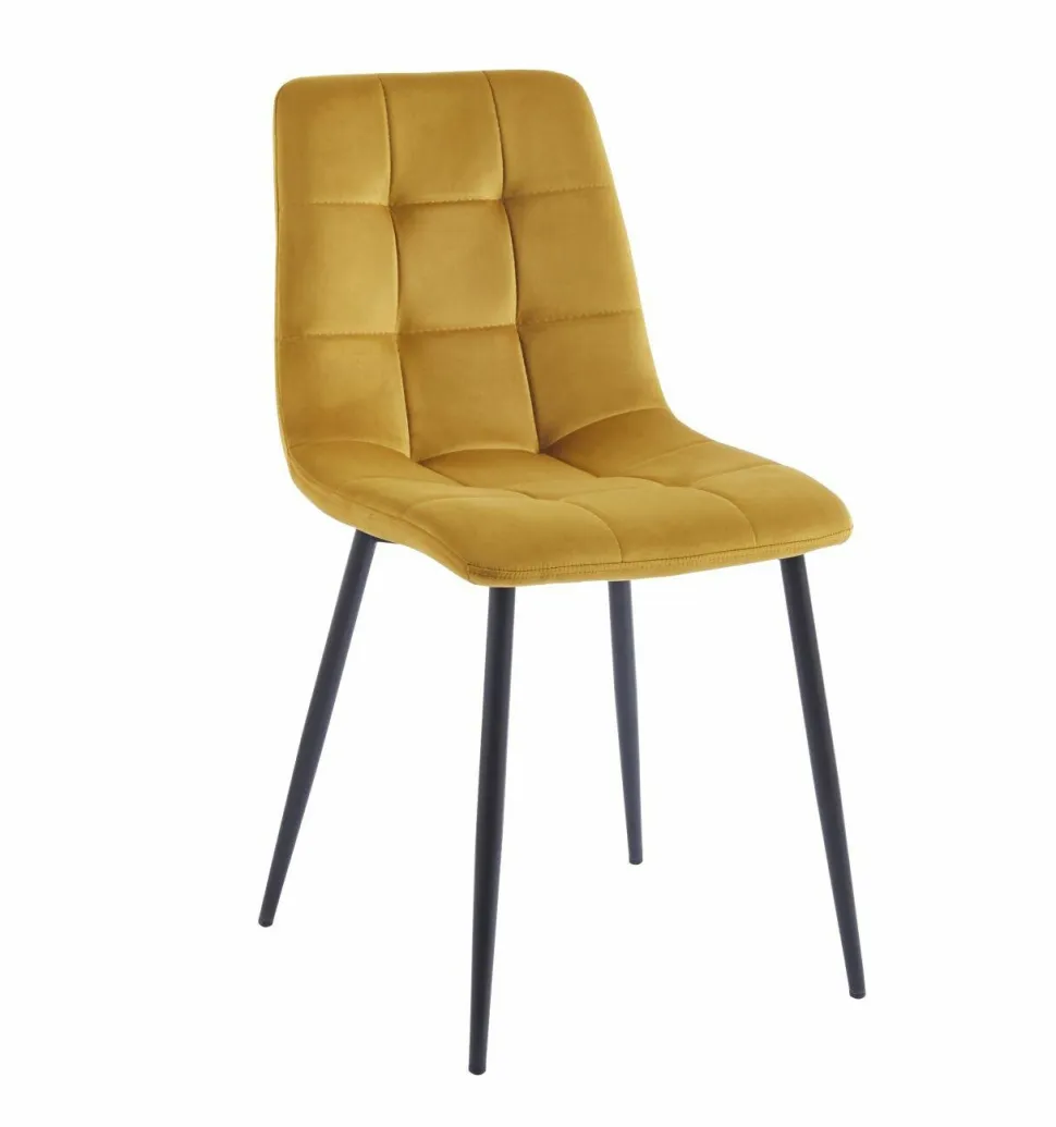 Tapicerka wykonana z welwetowej tkaniny jest nie tylko miła w dotyku, ale również nadaje wnętrzu subtelny, luksusowy charakter. Ozdobne pikowania na całej powierzchni tapicerki dodają krzesłu wyrafinowanego wyglądu, podkreślając jego wysoką jakość wykonania. Stelaż krzesła wykonany został z metalu malowanego proszkowo, co gwarantuje jego trwałość i stabilność. Czarne, smukłe nogi doskonale komponują się z żółtą tapicerką, tworząc harmonijną całość. Dzięki swojemu uniwersalnemu designowi oraz dostępności w różnorodnych kolorach, krzesło Caro Velvet świetnie wpasowuje się zarówno do stołu jadalnianego, jak i eleganckiej toaletki.