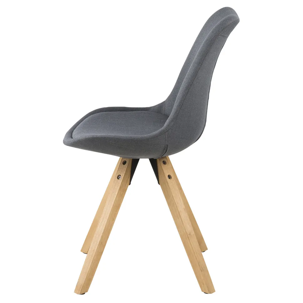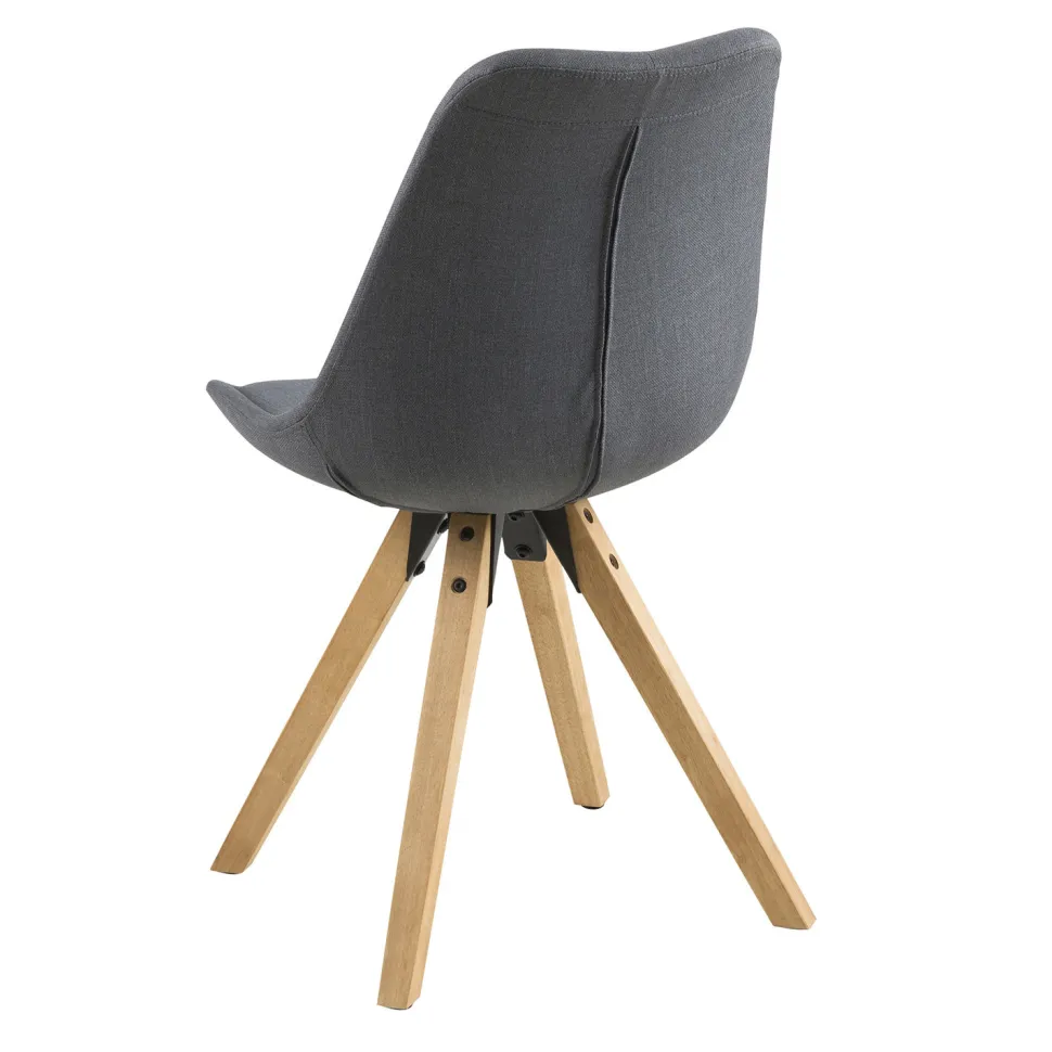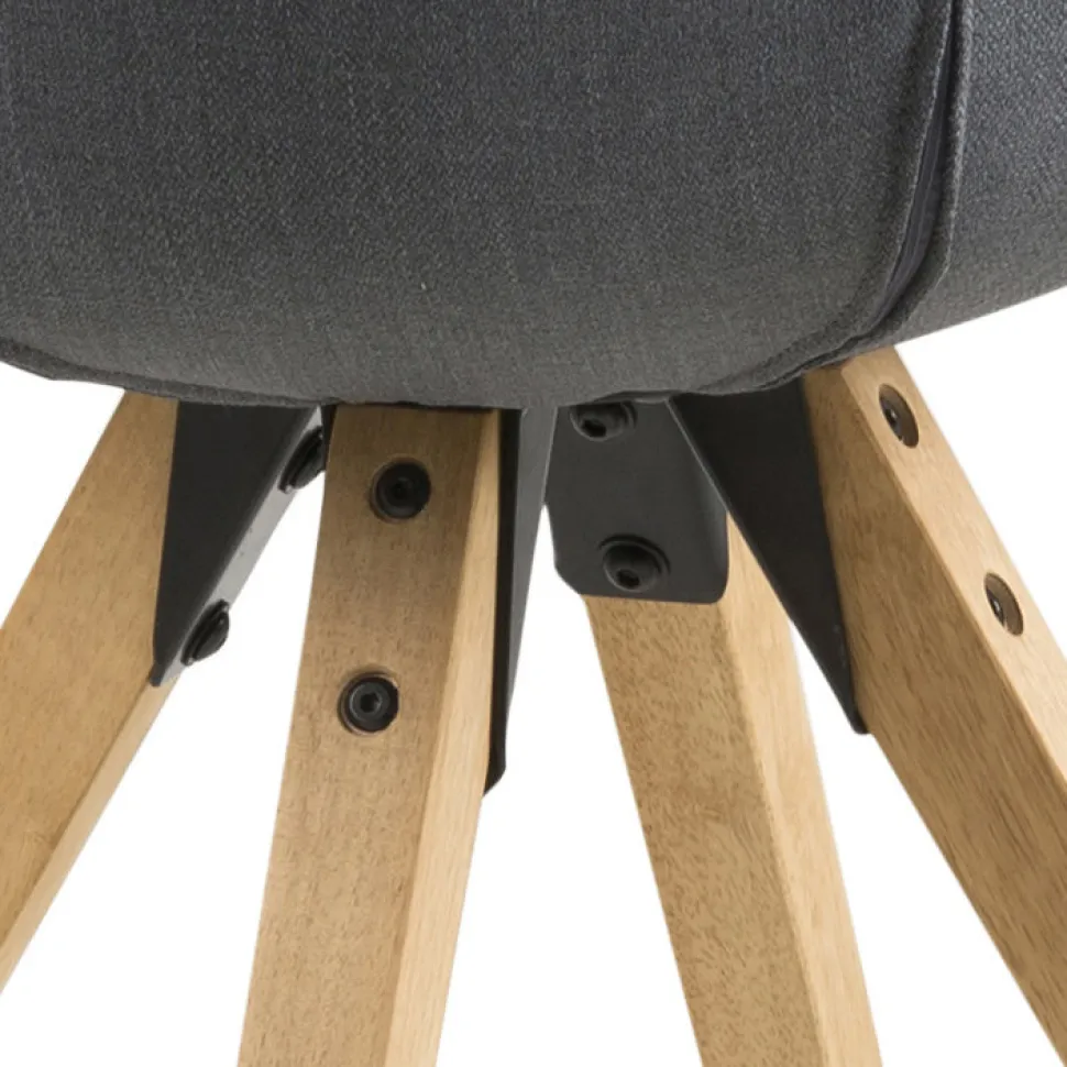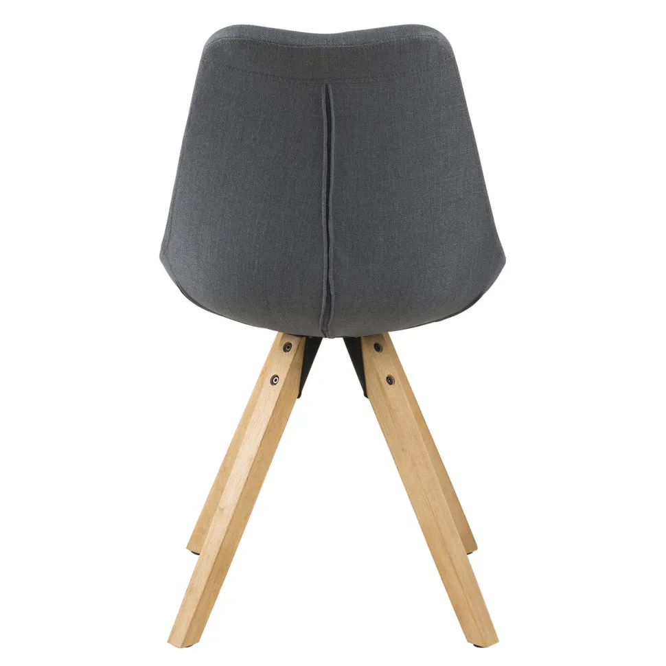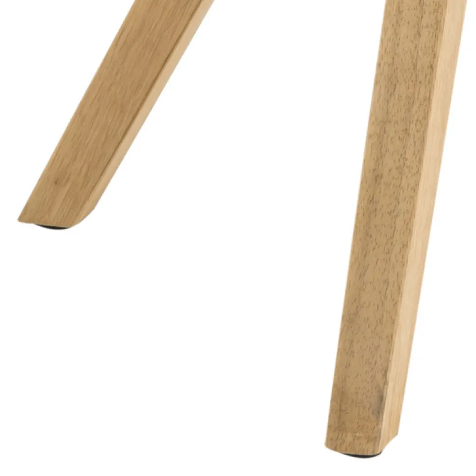 Podstawa krzesła Dima wykonana została natomiast z olejowanego drewna kauczukowego. Jego powierzchnia pokryta jest bejcą w kolorze dębu, co podkreśla naturalny wygląd drewna, a jednocześnie zabezpiecza podstawę przed zniszczeniami. Cztery grube drewniane nogi ustawione pod kątem zapewniają bezpieczeństwo i stabilność. Krzesło wymaga montażu podstawy do siedziska za pomocą śrub.