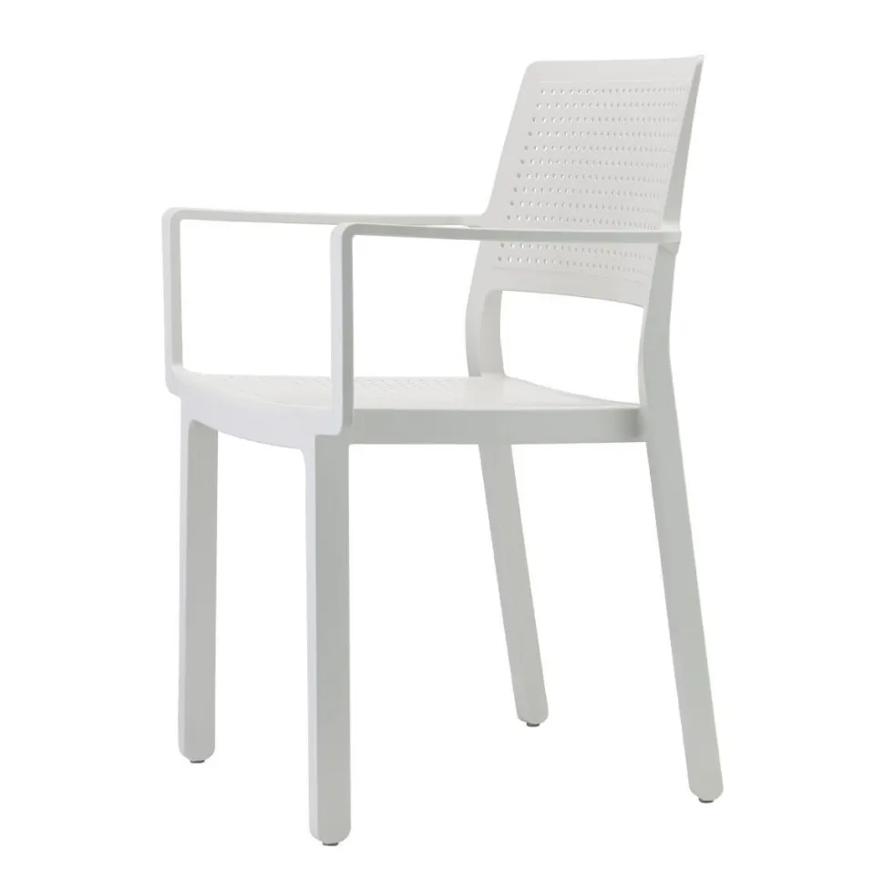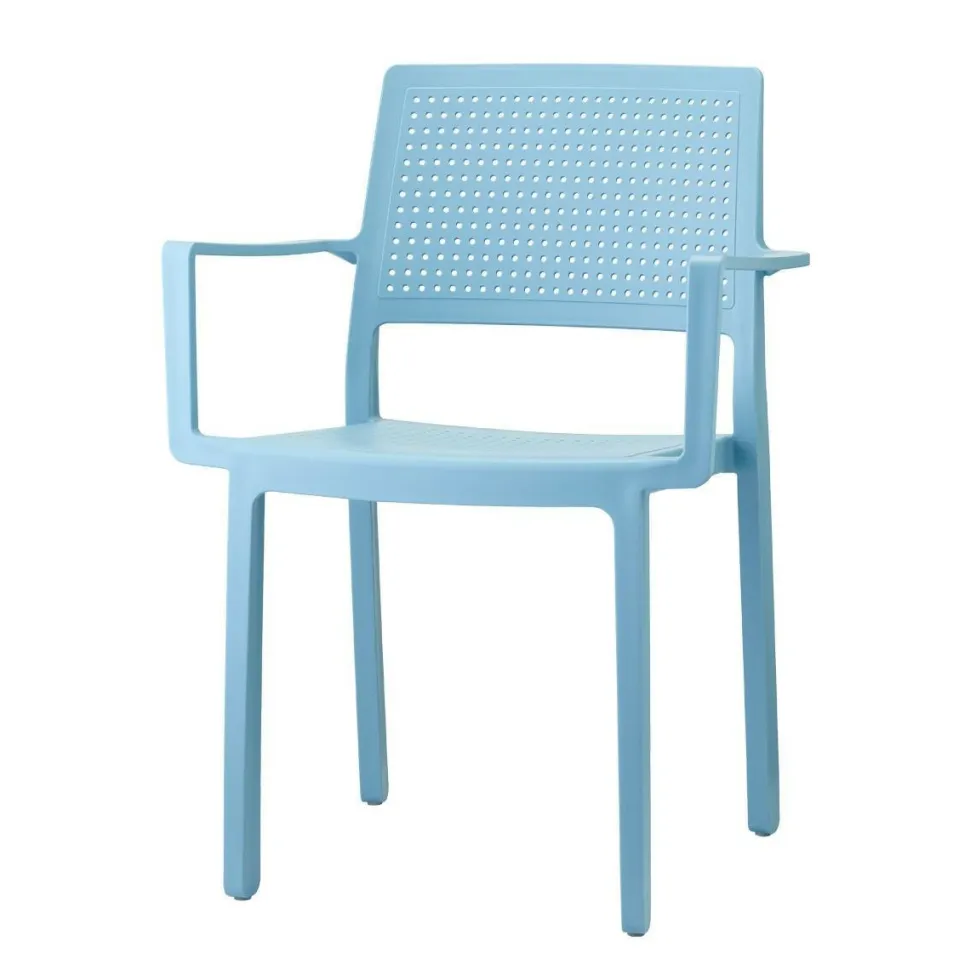 Krzesło Emi to kolejna odsłona klasycznego siedzenia stworzonego z myślą o naszych pięknych ogrodach, tarasach i balkonach. Z pewnością nie raz zdarzyło ci się podczas grilla u znajomych usiąść na pękniętym krześle po przejściach. Krzesło zostało w całości wykonane z techno polimeru, a dodatek perforacji sprawia, że jest ono bardzo wytrzymałe, a upadek nawet podczas najbardziej szalonych imprez staje się tylko przeszłym wspomnieniem. Jednak Emi dzięki swojej prostej, nowoczesnej formie sprawdzi się świetnie również w innych pomieszczeniach na przykład komercyjnych wnętrzach. Specjalny kształt nóg, sprawia, że krzesło sztapluje się, nie pozostawiając szczelin. Dzięki takiej budowie krzesło można sztaplować nawet na bardzo dużych stosach, co znacznie ułatwia przechowywanie. Dzięki półmatowemu wykończeniu, bez problemu można je szybko i sprawnie oczyścić z powstałych zabrudzeń, a obawa przed zniszczeniem krzesła przez niespodziewany deszcz czy intensywne promienie słoneczne może raz na zawsze wypaść nam z głowy, ponieważ Emi to gwarancja odporności na działanie wielu warunków atmosferycznych. Krzesło dostępne w różnych wariantach kolorystycznych oraz w wersji z lub bez podłokietników.