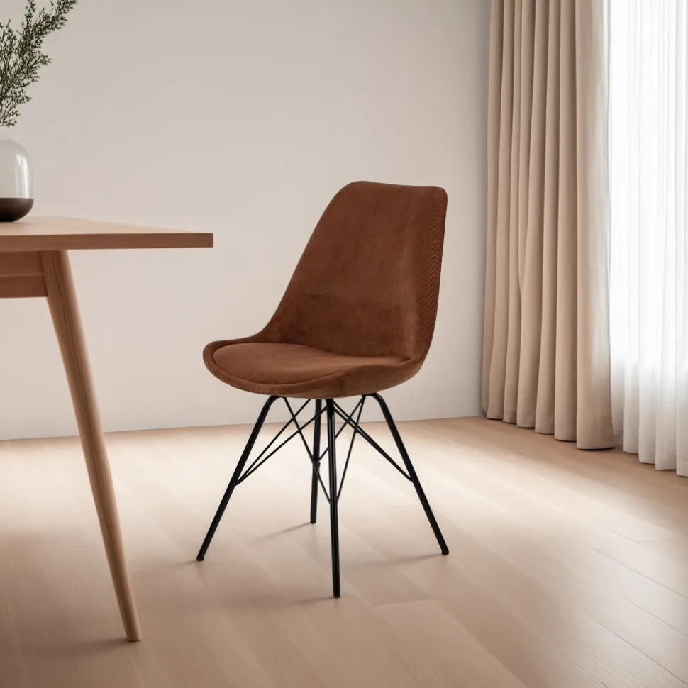 Szukasz rozwiązań, które łączą w sobie funkcjonalność i elegancję?Krzesło Eris Sztruksto mebel, który wyróżnia wyjątkowalekkość i delikatność formy. Jego profilowane siedzisko posiada subtelnie zaokrąglone krawędzie, które pozwalają nawysoki komfort użytkowania. Dzięki temu bez problemu będziesz mógł spędzić na nim długie godziny przy rodzinnym stole lub podczas pracy przy biurku. Stworzona z polipropylenu forma pokryta została tkaninąWind Cooper 100, która jestniezwykle miła w dotyku, a dodatkowo przez sztruksową tkaninę prążkowaną daje ciekawy efekt wizualny. Subtelność tego wygodnego krzesła podkreśla metalowa podstawa malowana proszkowo w odcieniu eleganckiej czerni. Pomiędzy 4 nogami znajdują się dodatkowe wsporniki, które sprawiają, żekonstrukcja jest stabilna i wytrzymała, przez co może unieść do 120 kg.